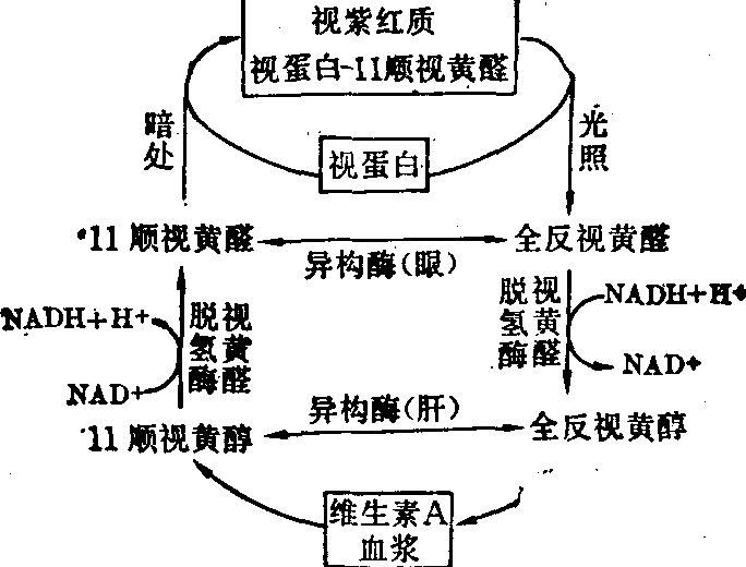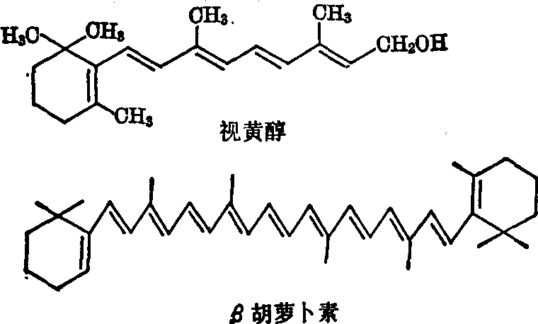 释义 | 维生素Avitamin A维生素A1(视黄醇)和维生素A2(3-脱氢视黄醇)的总称。化学结构本质是一个β-紫罗兰酮环和二个异戊二烯组成的一元醇。淡黄色晶体,不溶于水,溶于乙醇等有机溶剂,易氧化。具有组成视色素、维持上皮组织的正常结构、促进黏多糖合成和骨骼形成及生长等功能。缺乏时,会出现食欲不佳、角膜溃疡、骨骼和牙齿软化、上皮组织角质化和对疾病抵抗力下降等情况。蟾皮病、干眼病和夜盲症为典型缺乏症。咸水鱼的肝脏中含有丰富的维生素A1,维生素A2则存在于淡水鱼的肝脏内。有色蔬菜中虽不含维生素A,但含有β-胡萝卜素,后者在人和动物体内可经酶作用转变为维生素A1 。 视黄醇(维生素A1) 3-脱氢视黄醇(维生素A2) 维生素A 维生素Aweishengsu A英文缩写 V ☚ 维生素缺乏症 夜盲症 ☛ 维生素Avitaminum A又叫维生素甲,系人体重要营养素之一。为脂溶性,主要存在于鱼肝油、各种动物肝脏、奶油、蛋黄、西红柿、胡萝卜和绿叶蔬菜中。其主要生理功能是维持上皮组织如皮肤、角膜、结膜的正常生理功能;参与视紫质的合成与暗视觉有关。如维生素A缺乏可发生皮肤角化症、干眼病、夜盲症等。医疗用于预防时1日2 000~4 000u;用于治疗量1次2.5万u;但不可长期大量应用、防止中毒。 维生素A脂溶性维生素类。为不饱和的一元醇,包括维生素A1和维生素A2两种。存在于动物性食物中。植物体只存在其前体,即β-胡萝卜素,故称维生素A原,在动物体内能转化为维生素A。缺乏维生素A可引起夜盲症和干眼病。 维生素Avitamin A亦称视黄醇。通常所谓维生素A系指维生素A1,主要存在于海产鱼类的肝脏中。维生素A2为3-脱氢视黄醇,主要存在于淡水鱼的肝脏中。维生素A在视觉中起着感光及分辨颜色的作用,同时对保护上皮粘膜的健康非常重要。缺乏时即出现暗适应不良、夜盲、干眼病、干皮病、生长延缓及不良等。 维生素A 维生素A维生素A又名视黄醇。植物不含维生素A,只含有各种胡萝卜素(有α、β、γ…等种)。许多动物包括大鼠、家兔、猪、羊、鸡等动物的肠壁细胞、肝细胞都能转化胡萝卜素为维生素A。人则只在肝中有这种转化作用。故维生素A只存在于动物组织。此外淡水鱼类还含有一种结构与维生素A基本上相同,不过β白芷酮环上多一个双键的物质。其生理意义也与维生素A完全一样,故称维生素A2,原称为A的则改为A1。动物体内有一种双加氧酶能在温和条件下使一分子β胡萝卜素转化成两分子维生素A醛(亦称视黄醛)。产物由视黄醛还原酶 (亦称视黄醛脱氢酶)催化转变成视黄醇,NADH参加反应。视黄醛与长链脂肪酸缩合成酯,由血液中一种特异的视黄醇结合蛋白运载至需要的场所。应该注意: 食物中维生素A和胡萝卜素的肠道吸收和体内利用,受许多因素的影响。 光照视紫红质引起神经兴奋导致视觉的机理已略有所知,看来这与视紫红质的变构,Na+透性及Ca++和cGMP浓度的增减有密切关系。 反视黄醛在视黄醇脱氢酶催化与NADH参与下转变成反视黄醇再经特别的异构酶作用变为11顺视黄醇(肝中也有此酶),后者又氧化成11顺视黄醛,在眼内与视蛋白结合成视紫红质发挥作用。从弱光破坏视紫红质到它在暗处的再生称为视循环。如果血液中维生素A的供应不足,延缓了恢复过程,致使患者暗适应不灵,称为夜盲症。 视循环 视锥是人类视网膜主要视觉因素,保证辨色视觉。其敏感的最高光谱为555nm,与视杆的500nm不相同。视锥的视阈比视杆高50~100倍,含色素甚少。视锥细胞虽有红、绿、蓝三种,但它们的生色团都由同一种视黄醛与不同视蛋白结合构成,所以每一个锥细胞只对一种颜色光敏感(少数细胞有混杂),每个细胞又各有自己的神经通路。当红光闪耀时,对红色敏感的视色素蛋白分解,引起相应的细胞神经兴奋并通过它自己的神经通路传到中枢,使人能看到红色。蓝色和绿色的辨认机理也相同。有色盲的人缺少对某种颜色敏感的视色素蛋白质。这是基因缺陷所致,称为遗传病,与维生素A缺乏无关。红与绿两色的视蛋白由X染色体控制,蓝色的则由常染色体控制。 维生素A缺乏日久将出现干眼病、毛囊角化,以及泌尿生殖道、呼吸道、消化道等的粘膜表皮细胞角化,甚至引起各种感染。因为维生素A是粘膜组织生成粘蛋白所必需的。它涉及粘蛋白的糖基化,可能是单糖的一种载体。故缺乏维生素A也影响骨胳生长,体内粘多糖与胶原物质的形成减少,细胞膜及亚细胞结构膜的完整均受不良影响。 鱼肝油,乳汁及黄油中富于维生素A。青、绿和黄色蔬菜中则含胡萝卜素。食物中每1μg视黄醇=6μgβ胡萌卜素=12μg其它胡萝卜素。或者3.3IU视黄醇=10IUβ胡萝卜素。 维生素A过多时不能排出,储在肝中,易造成骨折、恶心、无力、皮炎、头痛、腹痛等。 ☚ 维生素 维生素D ☛ 维生素A 维生素A维生素A(vitamin A),是以视黄醇(retinol)为代表的一组化学和生物活性相类似的化合物,含有20个碳原子的不饱和脂肪属化合物,具有一个6元环和侧链的二萜类的基本结构,有促进生长、繁殖、维持正常骨胳、上皮组织、视力和粘液分泌等多生理功能。在体内视黄醇氧化代谢为相应的醛—视黄醛,和酸—视黄酸,后两者均有活性。是脂溶性维生素,故不溶于极性溶剂,而溶于非极性溶剂和油或脂肪中。它对紫外线不稳定。视黄醇易被空气氧化,但在油溶液中较稳定。其酯较游离醇稳定。于1913年两组美国学者同时