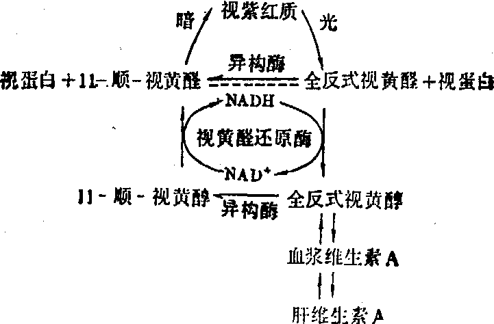 β-胡萝卜素 吸收、贮存和转运 维生素A(视黄醇)主要经过酯化,以维生素A酯(视黄酯)的形式存在于食物中,在肠腔内被水解酶分解为视黄醇。视黄醇被吸收入肠粘膜细胞后又迅速被酯化,经淋巴系统输入血液。β-胡萝卜素经肠粘膜细胞内存在的β-胡萝卜素-15,15’-二氧酶,在氧分子的参与下,从中央分裂成视黄醛(维生素A醛),再经醛还原酶转变为维生素A醇,再酯化后进入淋巴系统。 维生素A酯在淋巴系统中与乳縻微粒结合进入血液,在肝外组织内经过脂肪水解作用除去乳縻微粒的绝大部分的甘油三酯,乳糜微粒的余留部分含有全部维生素A酯,且几乎全部进入肝脏。维生素A酯在实质细胞表面进行酯类水解形成视黄醇,进入细胞后将再被酯化。人体内的维生素A约90%贮存于肝脏。 维生素A从肝脏转移出来时,视黄醇与一种特异的视黄醇结合蛋白(RBP)相结合,通过血液运转到外周组织,以供代谢需要。在正常情况下差不多血浆中所有RBP都以RBP-PA(prealbumin)复体的形式进行循环。RBP-PA的形式,除了稳定视黄醇与RBP相结合之外,还降低了小分子RBP的肾小球过滤和肾的分解代谢。因此,这一复体的作用减低了肾脏从循环中移去维生素A和RBP的速度。已经测出RBP的分子量约为21,000。RBP从肝脏释放到血清,需要维生素A,其释放量与维生素的给予量成比例,目前已利用血液RBP的含量作为衡量人体维生素A营养状况的指标。RBP可用放射免疫法测定。 生理功能 维生素A具有促进动物生长与繁殖、维持上皮组织与正常视力的生理功能。视黄醇与视黄醛在机体内可相互转化,均具有上述全部功用。视黄醛进一步氧化形成视黄酸(维生素A酸),这是一个不可逆转的反应。视黄酸能促进动物生长,但在视觉过程中无活性,也不支持动物的正常繁殖。 维生素A是视色素的组成成分。它在视觉过程中的作用已经了解得比较清楚。视网膜中有两种高度特异性的感光受体: 锥体适应视力的强光(明视); 杆体作用于视力的暗光(暗视)。锥体和杆体均借助于视色素感光,锥体的视色素为视紫蓝质,杆体的视色素为视紫红质。两种视色素的区别在于视蛋白的不同,其辅基均为11-顺-视黄醛。当光线刺激杆体时,11-顺-视黄醛异构化为全反式视黄醛,视紫红质分解为视蛋白与全反式视黄醛,全反式视黄醛在异构酶的作用下,又形成11-顺-视黄醛,后者在暗环境中重新与视蛋白结合成视紫红质,在暗光下恢复视觉。在此过程中,一部分视黄醛被还原为视黄醇,与血液中维生素A一道循环,被异构化为11-顺-视黄醇,随后氧化为11-顺-视黄醛,再和视蛋白结合,重新合成视紫红质,完成了视紫红质再生循环。此时如果机体中维生素A营养状况较差,血液中维生素A含量低,则单位时间内视紫红质的合成量少,暗光下恢复视觉所需的时间较长;相反,如果机体内维生素A营养状况良好,则单位时间内视紫红质合成量较多,暗光下恢复视觉所需时间较短。此乃用暗适应方法来衡量人体维生素A营养状况的理论根据。人若缺乏维生素A,视紫红质合成量不足,在暗光下看不清四周的物体,这便是夜盲症。维生素A在暗视觉中的作用图解如下: