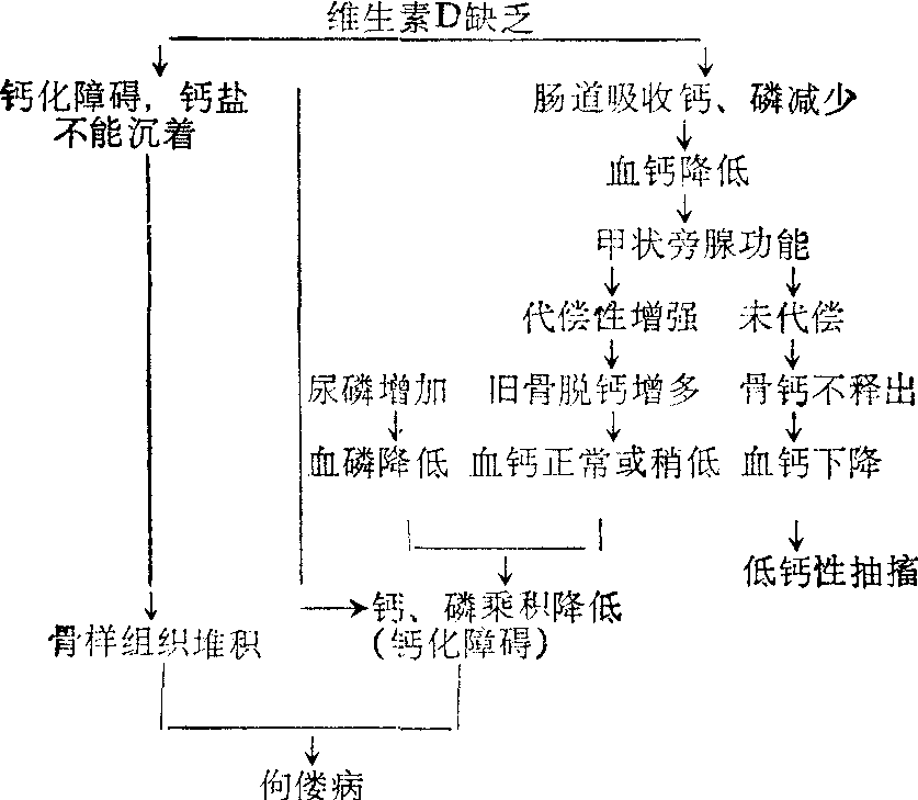 释义 | 维生素D缺乏性佝偻病 维生素D缺乏性佝偻病由于维生素D不足,致钙、磷代谢失常而引起骨骼发育障碍及全身生理功能紊乱。3岁以内为主要发病年龄。病因: ☚ 5.12 预防常见病 佝偻病性手足搐搦症 ☛ 维生素D缺乏性佝偻病 维生素D缺乏性佝偻病weishengsu Dquefaxing goulou bing由于维生素D不足,致钙、磷代谢失常而引起的骨骼发育障碍及全身生理功能紊乱。3岁以内为主要发病年龄。病因: ☚ 治疗膳食 佝偻病性手足搐搦症 ☛ 维生素D缺乏性佝偻病rickets due to vitamin D deficiency为小儿常见病。系因维生素D缺乏、钙磷代谢失常而引起的骨骼病变。可有易激惹、不安、夜惊、多汗、肌肉松弛、肌张力低下、腹部膨隆、枕秃、方颅、颅骨软化、囟门加大及颅缝加宽、乒乓球颅、串珠肋及郝氏沟、脊柱弯曲、“O”形腿或“X”形腿等。X线及血生化检查对诊断有重要意义。治疗应补充维生素D及紫外线照射等。 维生素D缺乏性佝偻病 维生素D缺乏性佝偻病维生素D缺乏性佝偻病是一种较多见的维生素缺乏病,因钙磷代谢失常,产生骨胳病变。本病常见于婴幼儿,我国北方发病率较高,据有的地区报道包括轻症在内3岁以内婴幼儿患病者可达60%左右。 临床表现 可分为活动期、恢复期和后遗期。在活动期早期,小儿已有精神神经改变如爱哭闹、烦躁不安、睡眠不宁等。可能因头皮出汗、刺激磨擦致枕、颞部头发脱落。病情进展时全身肌肉松弛、肌张力低下,腹膨胀如蛙腹。骨胳的改变,常先见于生长最快的部位: 3~6个月的婴儿出现颅骨软化,用手指按压顶骨或枕骨中央部位可有乒乓球样感觉; 6个月以后由于两侧额、顶处骨样组织堆积而形成方颅,有时呈鞍形或十字形。前囟闭合延迟,在胸部肋软骨与肋硬骨交界处可触到或见到半球状隆起,上下相连形成串珠样,称为佝偻病性串珠(严重时胸腔内部的串珠可压迫肺脏而致局限性肺不张,这些病孩患肺炎后迁延不愈)。软化的肋骨不能耐受膈肌的牵引力,于是沿膈肌附着处发生内陷,形成“郝氏沟”。在腕、踝骨骨骺处骨样组织增生而致局部膨出呈手镯样或脚镯样。下肢可弯曲畸形。极严重的病例牙齿晚出并缺少釉质或出牙顺序颠倒。疾病初期血钙低,当出现甲状旁腺代偿性功能亢进后血钙正常或稍低、血磷偏低、血碱性磷酸酶轻度增高。临床症状及体征明显时称为极期,此期血钙稍低(正常为10~11.5mg/dl),血清磷低于4mg/dl(正常值为4~6mg/dl),钙磷乘积小于30(正常为40),血碱性磷酸酶明显升高。骨胳X线的典型表现为长骨干骺端临时钙化带增宽,模糊,可呈毛刷样改变,并可凹陷呈杯口样,骨皮质变薄,骨小梁稀疏、甚者有骨质疏松等。 恢复期时上述一般临床症状消失,已形成的轻度骨胳改变可消失。血钙、磷及碱性磷酸酶值逐渐恢复正常。骨胳X线改变出现临时钙化带、骨小梁致密、骨膜增生、核距缩短、骨质逐渐钙化修复。 后遗症期仅留有骨胳的畸形如鸡胸、漏斗胸、膝内翻(X型腿)及膝外翻(O型腿),脊柱弯曲等。血液生化测定及骨胳X线摄片均正常。 诊断及鉴别诊断 根据临床症状、体征、血液生化测定及X片骨胳检查并结合年龄、季节、生活习惯、喂养史等可作出诊断。但绝对不能仅凭出汗、“枕秃”或乳牙长出稍晚而诊断为佝偻病。对三个月以内的婴儿,尤其是未成熟儿,不能仅凭出汗、烦躁不安及轻度颅骨软化即诊断为佝偻病活动期;3个月以上的小儿有上述表现时还应配合骨胳X线及血液生化检查方可确诊。一般生化改变先于骨胳X线改变。出牙延迟并不是佝偻病的常见表现,仅见于极严重的病例。鉴别诊断中需与甲状旁腺功能低下、软骨发育不良、肾性佝偻病、肾小管性酸中毒、家族性低磷酸盐血症性抗维生素D佝偻病及范可尼综合征等区别。 预防 应重点抓好 ❶孕妇及乳母应注意饮食调配,常食含维生素D及钙磷丰富的食物,并应多晒太阳。孕期4~5月后有腰酸腿痛、肌肉抽动时应加服钙片和维生素D。 ❷新生儿出生后半个月~1月即开始每日服维生素D400IU(可根据地区纬度增减其用量),未成熟儿或双胎儿给量应略多。2~3岁后小儿生长速度渐缓,加以户外活动较多,食物多样化,佝偻病发病率低,故不需再服维生素D。 ❸坚持体格锻炼,经常打开居室中门、窗流通空气,每日到户外活动1~2次,多接触日光 (注意室内隔着玻璃不能吸收紫外线)。 治疗 (1) 活动期患儿根据病情轻重每日服维生素D10,000~20,000IU,严重者可增多至每日40,000IU,持续一个月后改服预防量。在夏季因接触日光较多可减量。病情较重或长期患消化系统疾病者在医生指导下可用突击疗法,即一次肌肉注射维生素D2或D3 30万~60万IU,一般注射一次即可,必要时重复一次 (极北地区可酌情增加次数)。注射后2~3月内不必再给预防量。应防止多次注射或在长期口服剂量较多时,又加用突击治疗,而出现维生素D中毒症(见“维生素D过量”条,51页)。 (2) 后遗症期的患儿应加强体格锻炼,促进体格发育。此时不需加用维生素D治疗,更应警惕应用大剂量维生素D引起的中毒症状。轻的骨胳后遗症可于生长发育过程中自然矫正。下肢显著畸形者如“X”型或“O”型腿可在4~5岁后由骨科医生决定是否作矫形手术治疗。 ☚ 维生素C缺乏病 维生素D过量 ☛ 维生素D缺乏性佝偻病 维生素D缺乏性佝偻病rickets of vitamin D deficiency是由于儿童体内维生素D不足致钙、磷代谢失常的一种慢性营养性疾