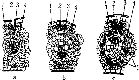 几种作物叶横切面的一部分 a.小麦叶 b.水稻叶 c.玉米叶 1.表皮 2. 机械组织 3. 维管束鞘 4. 叶肉细胞 5. 花环结构 |