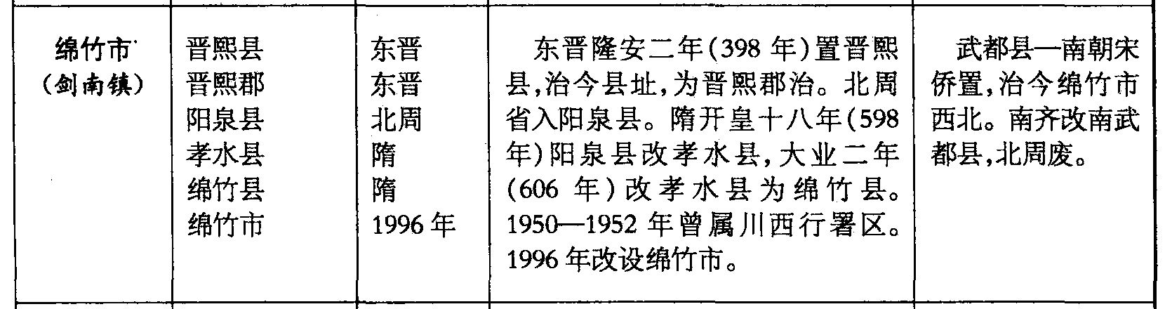绵竹市(剑南镇)晋熙县晋熙郡阳泉县孝水县绵竹县绵竹市东晋东晋北周隋隋1996年东晋隆安二年(398年)置晋熙县,治今县址,为晋熙郡治。北周省入阳泉县。隋开皇十八年(598年)阳泉县改孝水县,大业二年(606年)改孝水县为绵竹县。1950—1952年曾属川西行署区。1996年改设绵竹市。武都县—南朝宋侨置,治今绵竹市西北。南齐改南武都县,北周废。
