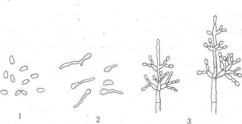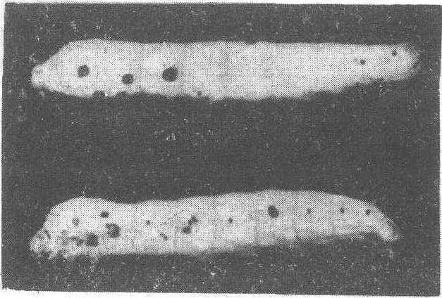 传染 绿僵病的传染源,是病虫尸体表面的分生孢子。以空气、蚕具和桑叶为媒介,病菌的分生孢子附着于蚕体,经皮接触传染引起发病。在温湿度适宜时,分生孢子发芽,经体壁侵入蚕体的经过时间,2龄起蚕为16~24小时,4龄起蚕为24~40小时。芽管贯穿体壁时,先在真皮细胞层,发育成菌丝体,并渐次生出芽生孢子。此时蚕体外形与健蚕无异,血色正常。患病后期,体壁形成病斑,病菌遂进入体腔,可见很多短菌丝浮游于血液中,濒死时病菌侵入肌肉,脂肪体寄生增殖,不久蚕停止食桑死去。4龄后期或5龄期感病的蚕都死于蔟中或蛹期,尸体变硬呈绿色。 病症 病程比白僵病迟缓,自感染起约经10天发病,小蚕比大蚕稍快。感病初期无明显病症表现,后期食欲减退,发育延迟,体壁上逐渐形成少数圆形或云纹状病斑。病斑大小不一,数个相连形成的 “集合斑” 比较大,病斑大多边缘色深,中间色淡,呈环状(图2)。此时病蚕血液白浊,用600倍显微镜镜检,可看到哑铃状或豆荚状的短菌丝,其大小不等,一般为3~4×8~10微米,将眠时发病的蚕,迟迟不能入眠,体色乳白,体皮紧张发亮,行动迟缓。病斑形成后,约经1~2天,食桑停止,不久死去,未见有“自然治愈”现象。初死蚕体软,伸直,略有弹性。死后约2~3天,先在环节间膜及气门处长出纤细的白色绒毛状气生菌丝,逐渐扩展,布满全身,并产生粉末状绿色分生孢子。死后约4~5天,尸体遂成绿色僵硬状态。以后孢子色泽转暗绿色,稍加振动,极易脱落飞散。 图 2 绿僵病蚕症状 诊断与防治 发现可疑病蚕时,依照本病病症对照可作初步诊断。进一步可取病蚕血液,镜检病原,如察见上述特殊形态的短菌丝,即可确诊。防治措施主要是做好蚕室、蚕具、养蚕环境的消毒,并在此基础上加强蚕体、蚕座消毒,消灭病原,防止接触传染。同时要重视对野外昆虫,包括大田害虫和桑树害虫的驱除,防止交叉传染。注意小蚕期保温,避免低温多湿。具体措施参照白僵病防治方法。 绿僵病秋蚕期常见的一种僵病,由真菌病原绿僵菌引起。因蚕尸上覆盖一层鲜绿色分生孢子,故名。致病过程同白僵病大致相同,但病势较缓慢,特异性病斑特点是在腹侧或背面出现黑褐色不规则轮状,云纹状病斑,病斑外围色深,中间稍淡。蚕儿死亡后,虽尸体也经“软化一硬化”的变化过程。但在此过程中尸体不产生“从尾部出现桃红色”的症状特点。取病蚕血液显微镜镜检,发现“豆荚状的菌丝体”即可作为本病早期诊断的重要依据。 |