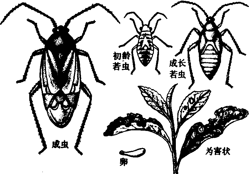 释义 | 绿盲蝽green mirid bug茶树芽叶害虫之一, 属半翅目盲蝽科, 学名为Lygus lucorumMeyer-Dur。 绿盲蝽 生活习性 在长江流域一年发生5代, 以卵在茶芽, 枝桩、冬作豆类和蒿类茎内越冬。翌年4月上、中旬孵化为若虫, 随即刺害一轮茶芽, 至5月中旬发育为成虫飞去, 迁至棉等其它植物上危害, 茶园虫口较少, 成、若虫生活隐蔽, 行动极为活泼, 喜湿, 晴日匿居丛间, 晨、昏和阴天昼间在芽叶上活动危害,刺吸频繁, 少量虫口即可使田间出现大量为害症状,密植多肥茶园更是如此。 防治 主要掌握越冬卵盛孵期, 当茶树出现被害症状时, 及时喷药, 通常可以喷施40%乐果、50%辛硫磷、50%马拉松或50%敌敌畏1000~1500倍液;2.5%溴氰菊酯, 20%杀灭菊酯或10%除虫精6000~8000倍液。 绿盲蝽green mirid bugLygus lucorum Meyer-Dur,昆虫纲,半翅目,盲蝽科。广泛分布于欧亚大陆的温带地区,遍及中国各地。寄主有棉、麻、苜蓿、胡萝卜、杞柳、大豆、玉米、麦、桑、茶、桃、李。成虫体长约5 mm,绿色;前翅基半部绿色,革质,端半部暗灰色,膜质,两个翅室棕黑色。若虫共5龄,末龄若虫体长3.2~3.8 mm,绿色。中国一年发生3~7代,以卵在寄主组织中越冬,南方地区卵和成虫均可越冬。成虫活动敏捷,有趋向现蕾开花期植物的习性。成、若虫刺吸为害棉嫩头、嫩叶等营养器官,造成叶片破烂,俗称“破叶疯”。棉花盛蕾期是主要受害期。在棉花上,卵多产于棉叶柄、叶片边缘和叶脉组织内。在茶叶上,卵多产于茶芽、枝梢、断桩等组织内越冬,成、若虫生活隐藏活跃,春季刺吸一轮茶梢。防治的主要措施是:清除田间杂草;对棉田、茶园外主要寄主上喷药以减少迁入虫源;蚕豆适时打顶;棉田、茶园内适时用药毒杀。 绿盲蝽 |