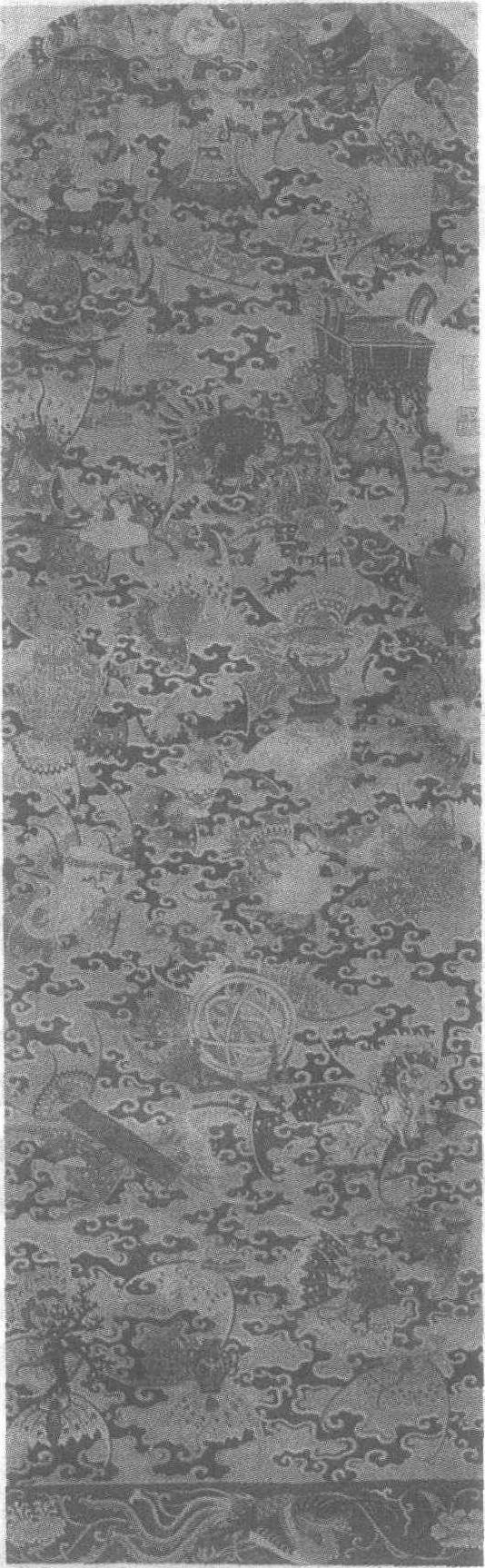 明。纵138厘米,横44.85厘米。辽宁省博物馆藏。“浑仪”也叫“浑天仪”,是我国古代测定天体位置的一种仪器。在支架上固定两个相互垂直的圈,分别代表地平和子午圈,其内还有若干个能绕一条和地轴平行的轴转动的圈,它们分别代表赤道、黄道、时圈、黄经圈等。“博古图”指图上绘有瓷、铜、玉石等各种古器物,上添加花卉、果品作点缀。此种题材作为装饰图案,寓意清雅高洁。此缂丝图以黄色半熟丝为地,五色流云和蝙蝠作地纹,上镶天球、河图、鼎彝钟鼓,金瓯玉斝环佩蝉珥、提垆筠花和梵文货帛浑仪博古图案,器物共计33种之多。由于图案的色彩和器形复杂多变,所使用的织法随之变化,运用结、勾、环、接、戏、双子母经以及盘梭交替,充分发挥了缂丝工艺技巧。作品下部的横栏为朱色织地,彩织凤穿花枝,与上部的云纹、蝙蝠纹、浑仪博古图上下辉映,充分体现了明代匠师们的巧妙构思。