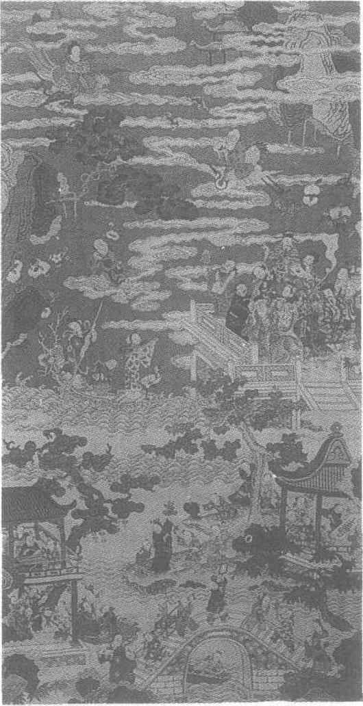 清。长176.5厘米,宽90.5厘米。江苏省南京博物院藏。此图轴分上下两部分,上部表现天上,背景为大红,白云缭绕,青松、桃树、寿石穿插其间,王母披羽乘鸾飞临,寿星捧桃跨鹤相迎,老翁驾云飘至,麻姑捧筝乘舟而来;下部八仙聚集于瑶台,由瑶池水浪过渡到凡间世界,背景以月白色为地色,与天界形成鲜明对比。其间亭阁、树木、山石、石桥、流水、百子戏耍其间,姿态各异。此图轴运用子母经、平缂、掼缂、缂金等缂丝技法,在大红、月白色地上配以三蓝、三绿,使画面更显清润繁丽。