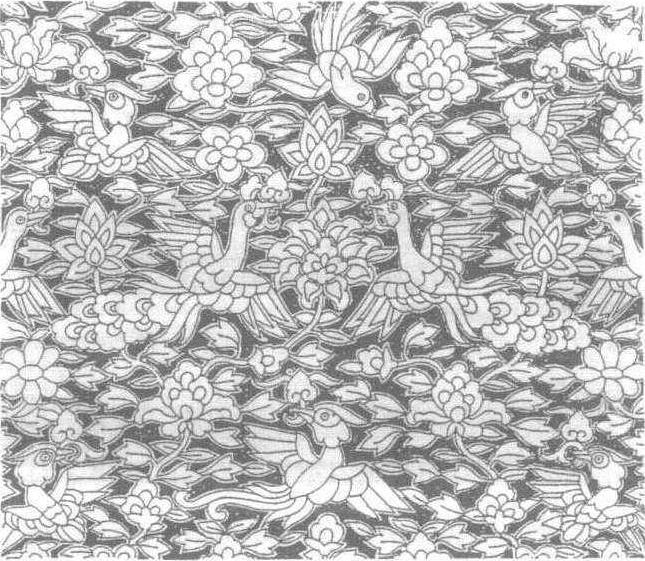 长131.6厘米,宽55.6厘米; 紫色地,以彩线缂织出鸾鹊、鹦鹉、鸂黄莺、孔雀、鸳鸯、鸠鸟、锦鸡八种瑞禽,其间衬以牡丹、莲花、海棠等四季花卉。图案以鸾鹊为中心,对称配置,瑞鸟衔枝,繁花簇簇,布局规矩而不失灵秀,配色幽雅又显出热烈,装饰性很强。紫为地色,鸾鹊指中心纹样,谱指图案单位,五排瑞禽为一谱。此件紫鸾鹊谱是北宋遗物,原作装裱皇家书画之用。现为辽宁省博物馆收藏。