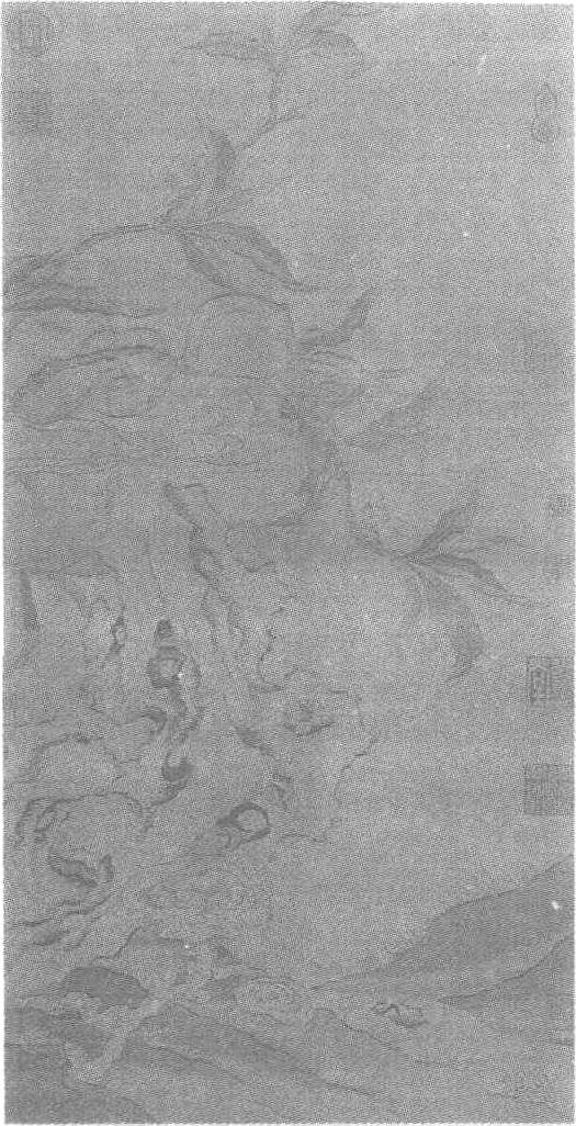 南宋。纵71.6厘米,横37.5厘米。辽宁省博物馆藏。五色紵丝织品,运用了勾缂、长短戏、渗和戏等缂丝技法,缂织有桃树、灵芝、寿石、溪泉。桃枝之上祥云萦绕,硕桃与盛开的桃花并生,并略施以彩笔渲染,使之更富有浪漫色彩。蟠桃自古有王母蟠桃之故事,其千年结子,故称“寿桃”;灵芝又称“瑞芝”,在帝王实行仁德之政时生成,有保长寿之功效,又有羽化成仙之传说,所以灵芝被认为是一种非常吉祥的植物;寿石是湖石的雅名;数者画在一处,寓长寿之意。幅下锈钤有: 〈耿氏鉴藏〉,〈乾隆御览之宝〉、〈宜子孙〉、〈石渠宝笈〉等织印款。