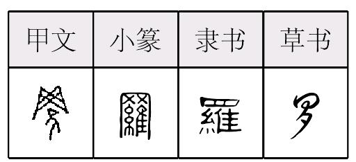 luó表意,甲骨文象网中有鸟之形,小篆从罒(网)、糸、隹,糸指丝,隹指鸟,隶定为“羅”。本义为用来捕鸟的网,引申为用网捕鸟、搜集、陈列、包容、一种孔隙较密的筛子、一种质地稀疏的丝织品等。元代俗字、《手头字》、《简体字表》、《简化字表》简作“罗”,用夕作符号代替原字下边的維。 【辨析】 ❶以“罗”作音符构成的形声字一般读luó:萝、锣、箩、逻、猡、椤。 ❷“罗(羅)”可作类推简化偏旁使用,如:箩(籮)、锣(鑼)、逻(邏)。罗 羅; 甲 篆 隶luó【析形】会意字。甲骨文字形像网中有隹,表示以网捕鸟。小篆字形增加意符糸,表示结网所用的材料。 【释义】《说文》:“以丝罟鸟也。”本义是用绳线结成的捕鸟网。作动词,指用网捕捉。由罗网的形状引申为排列、广布,由用网捕捉引申为收罗、招集,皆为后世常用义。[门可罗雀]形容门庭冷落,来客绝少。 【shape analysis】It is the associative character.In Oracle,it looks like a bird in the net,which means using the net to catch birds.In Small Seal script,it was added a meaningful part—糸(mì,cloth)which means the materials for making net. 【original meaning】The net forged with wires and ropes to catch birds. 罗(1)〈动〉亵语。本义为搞、弄,转指男女交媾。 《醒》五六: 你就实说,你或是拾或是买的?或是从觅汉短工~的?又七六: [素姐]又与调羹合气,说是孩子不是他公公骨血,是别处~了来的。又: 你知道你又得了兄弟了?一年~一个,十年不愁就是十个! <方>今山东菏泽话有此义。 (2) 〈量〉借作“摞”。堆。 《聊·蓬》四: 娘子一霎抄了一~,晌午多已是完了一部。又 《禳》三三: 公子云:“向来不曾查你账目,快拿账来我看。”兰芳抱了一大~来,云:“官人请看。” <异>箩。《聊·墙》四: 这浮财也还多,当日文书一大箩,有中人到底还不错。 |