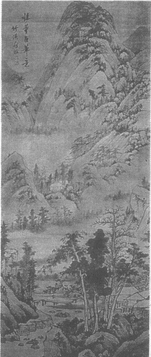 清。罗牧绘。纸本水墨。纵279.5厘米,横117.5厘米。山东省泰州市博物馆藏。罗牧(公元1623—?年),字饭牛,江西宁都人,寓居南昌。善书画,笔意在董其昌、黄公望之间,而渐创独特风格。其画林壑森秀,墨气滃然,颇具妙韵,为江西派创始人。康熙十六年(公元1707年),85岁时尚在。作者在此图中以有限的篇幅安排了遥深的场面,兼具平远、高远二法。几株山石间生长的乔木为眼前之物,在此望去,屏列的秀峰层叠不绝。山间泉水汇聚成溪,似潺潺有声横跨木桥通向彼岸村落。峰峦重叠,林木繁茂,房舍庙宇掩映其间,再配以云雾烟霞,具有深秀空灵的情致。山石多作长披麻皴,点苔松活,墨色浓淡兼具。树干采用双勾,树叶十分写意,具有苍秀古朴之气。作者笔法流畅沉着,墨气滃然,苍莽雄浑的气势跃然纸上。画左上方题“临董、巨笔意。”款署“竹溪罗牧”。