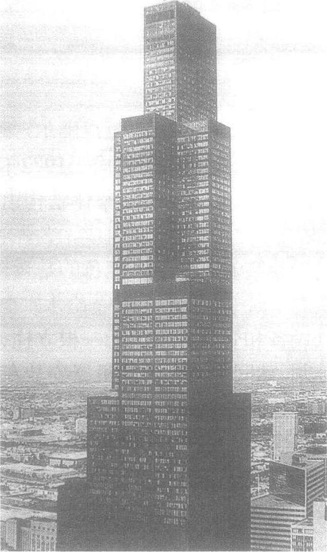 已建成的世界最高的建筑,建成于1974年。高443m,地上共110层,地下三层,总面积为41.8万m2,由9个边长22.9m的正方形组成一个大正方形平面,采取分段收缩的方式,在51层以上切去二个对角的正方形,67层以上再切去另外二个对角的正方形,91层开始仅有二个正方形到顶,突破了通常高层建筑因结构抗震和抗风的要求所带来的体型呆板对称,缺少变化的缺陷,9个方形筒体集束在一起,形成了新的筒体结构的体系。大厦安装了182部电梯,分段设置,在33层和66层有换乘的门厅,如多个高层叠合在一起。大厦由美国著名的设计公司SOM设计。其作品遍及40多个国家,具有优美平实,易于被人接受的建筑风格。