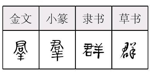 【提示】 , 有插笔穿过, 中间横笔右端出头; 不要错写成彐。 *群〔羣〕qún13画 羊部 (1) 聚在一起的许多人或物: 人~|羊~|建筑~|三五成~。 (2) 成群的: ~岛|~峰|~居。 (3) 众多的人: ~情振奋|~策~力|技艺超~。 (4) 量词。用于成群的人或东西: 一~孩子|一~~鸭子|一~岛屿。 群羣qún春秋以来的形声字。从羊,君声。声母演变旁纽双声如君裙、角确、斤芹例。自春秋金文,战国文字,小篆至西汉隶书都是上君旁下羊旁。东汉以后有作群的、左君声旁右羊旁。便于单字书写也便于横行和阅读。现作规范字。以上君旁下羊旁的为异体字。见《异体字表》。指相聚成伙的,聚集在一起的。本指羊,也因羊常聚集在一起的。如:一群羊|人群|群岛|害群之马。引申指众人。如:群策群力|群起而攻之|群防群控。 群羣★异◎异★常◎常