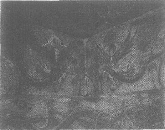 高句丽(公元6世纪)。纵55厘米,横160厘米。吉林省集安县五盔坟4号墓藻井北面第一重抹角石上壁画。《山海经·大荒南经》郭璞注:“羲和盖天地始生,主日月者也……。”由此可知羲和乃主日月之神。常羲,古音读羲为“娥”,故逐渐演变为奔月之嫦娥。图中羲和居左,常羲居右,皆人首蛇身。羲和为男相,着羽毛,展双翅,双手举日轮过顶,中立三足鸟,身体绘有彩虹般色彩。常羲为女相,长发飘逸,面庞秀丽,着红色羽衣,双手捧月轮过顶,月中有蟾蜍。二神相向而飞,周围绘有草、树。此图人物形象俊美,线条流畅精致,羽毛细腻,色彩艳丽和谐,是一幅艺术价值很高的作品。