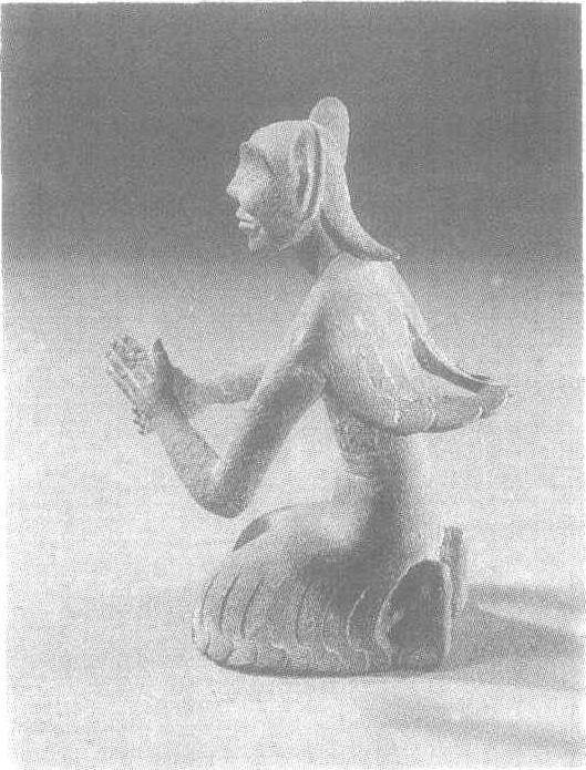 西汉。高15.3厘米。1966年陕西省西安市西北郊出土。陕西省西安市文管会藏。此铜羽人的形状很奇特,长脸尖鼻,颧骨、眉骨隆起,两个大耳竖立,高出头顶,脑后梳有锥形发髻。初看面目狰狞,细看则眉宇眼角间隐隐流露出一丝微笑。曲膝跪坐,身向前伸,穿一件无领紧袖交襟长衣,宽肩束腰,背部有卷云纹双翅。两臂肘向前斜垂而曲伸,左手指并拢直伸,右手指直折向内,两手高低形成似拱方形器物形状。两膝盖间有一半圆形竖洞,底部有一小孔,是为了固定器物用的。羽人臀部坐脚跟,衣服后露出一对赤足。考古学者曾将这件铜羽人与汉画像砖上的乐舞人作了对比,有同样跪坐的姿势,但无大耳和双翅。因此,他不是汉代的乐舞人。这种人物形象,可能与汉代封建统治阶级所幻想的“羽化登仙”的宗教思想有密切的关系。该器物无疑是汉代封建统治阶级的生活用具,夸耀豪富的陈设品和表示其宗教信仰的供物,但却是当时手艺高强、富于创造性的劳动人民铸造的,因此,对于研究我国汉代的艺术水平有一定的价值。