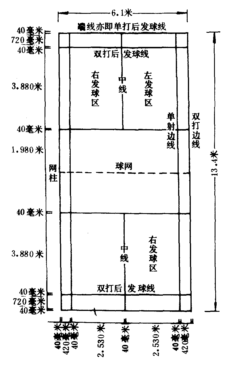 呈长方形,长度为13.40米,单打球场宽5.18米,双打球场宽6.10米。球场外面两条边线是双打场地边线,里面的两条边线是单打场地边线。双打边线与单打边线相距0.46米。靠近球网1.98米与网平行的两条线为前发球线,离端线0.76米与端线平行的两条线为双打后发球线。前发球线中点与端线中点的连接线叫中线,它把场地分为左、右发球区。各条线宽度均为4厘米。整个场地的丈量从线的外沿计算。场地上空10米和四周2米以内不应有障碍物(包括相邻的球场)。场地中间张挂球网,标准的球网长6.10米,宽76厘米,每个网孔为1.9厘米见方。网的上沿缝有7.5厘米宽的双层白布,内用细钢丝或结实的绳子穿起来挂在网柱上。球网应为黄褐色或草绿色。规则规定,球网中部上沿离地面1.524米,两端高为1.55米。两根网柱分别立在双打场地边线的中点上。(见图2—3—23)