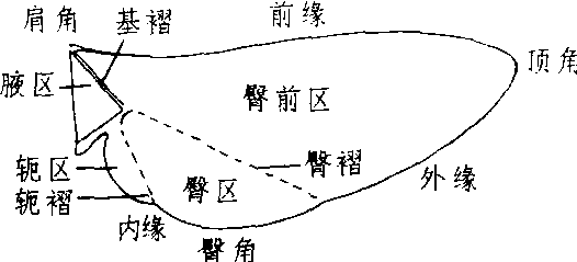 翅chì也称“帽翅”。幞头、纱帽两侧翘出的翅状饰物。常见者有方形、圆形、尖形、长方形、椭圆形及凤翅形等。《周书·异域传上·百济》:“朝拜祭祀,其冠两厢加翅,戎事则不。”唐段成式《酉阳杂俎·艺绝》:“有顷,眼钩在张君幞头左翅中,其妙如此。”明方以智《通雅》卷三六:“智按所谓耳者,即近代之帽翅,所谓高蝉也。”清刘廷玑《在园杂志》卷三:“家藏遗像二轴,予亲见之。一为张公坐像,戴纱帽而两翅尖锐,服大红纻丝仙鹤背胸,腰围玉带;一画世宗皇帝像……张公远来朝谒,戴长扁翅纱帽,如今戏中扮官长所戴者,服蟒衣、玉带、皂靴,全不似今戏中所戴丞相幞头,上面皆方,而两翅扁方曲长以向上者。”张德坚《贼情汇纂·伪服饰》:“(洪秀全)冠如圆规纱帽式,上缀双龙纱帽上的翅双凤,凤嘴左右向下,衔穿珠黄绥二挂,冠后翅立金翅二。” 翅wing昆虫的飞行器官。广义的翅也指鸟类等动物的飞行器官。昆虫的翅在分类学上有重要意义。大多数昆虫具两对翅,位于中、后胸两侧,由其侧背叶演化而成。不全变态昆虫的翅在体外发育,若虫的翅芽随龄期增加而逐渐长成.称为外生翅;全变态昆虫的翅芽在幼虫体内发育,至蛹期形成(翻出),称为内生翅。由于翅质、形状和功能不同,翅可分为膜翅、覆翅、半鞘翅、鞘翅、缨翅、毛翅、鳞翅和平衡棒。典型的翅略成三角形,分为前缘、外缘、内缘并形成肩角、顶角、臀角。翅面划分为腋区、臀前区、臀区、轭区,多数昆虫的翅有多条纵脉和横脉,在飞行中起支撑翅面的作用。 翅的分区 翅 翅chi(1)动物飞行的器官,统称为翅。在无脊椎动物中,昆虫大多有翅两对,在中胸和后胸节背侧,由表皮角质膜及其间气管延伸所形成。但双翅目蝇类只有前翅,后翅变成平衡棒; 脊椎动物鱼类如鲨鱼的鳍特称为鱼翅;飞鱼的胸鳍特别长大,呈翅状,能跃出水面,可滑翔百米以上,供以逃避敌害,故也称为翅。又如鸟类的翼和哺乳类蝙蝠的飞膜 (或翼膜),均能飞行,因由前肢 (膀) 演变而来,故统称翅膀。(2) 被子植物的果实,如槭、榆等的翅果和裸子植物的种子,如松属等,都具有向外伸展的薄片,也称为翅。 ☚ 翼 翎 ☛ 翅翄chì❶昆虫和鸟类等动物的飞行器官,通称翅膀。 翅[翄]chì❶ (翅膀) wing: 公鸡振 ~ 啼叫。 The cock clapped his wings and crowed. 翅chì