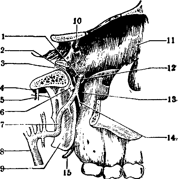 释义 | 翼腭窝综合征pterygopalatine fossa syndrome系原发或继发于翼腭窝处病变而引起的一组征群。多见于肿瘤。此症以眼部症状最为突出如病侧眼球突出、运动障碍、失明,可有视神经炎、视神经萎缩;可有三叉神经1、2支分布区域疼痛;翼状肌麻痹者张口时下颌向患侧偏位,也可有软腭麻痹;晚期病侧出现传导性耳聋。X线拍片可见翼腭窝处骨质破坏。本症预后不良。 翼腭窝综合征 翼腭窝综合征翼腭窝综合征(pterygopalatine fossa syndrome)多为鼻咽癌、上颌窦癌或鼻咽纤维血管瘤等侵入翼腭窝内所产生。翼腭窝是上颌窦后外侧壁与蝶骨翼突间的锥形间隙,上为蝶骨体,前为上颌骨,内为鼻腔外侧壁,后有翼板、腭帆张肌、腭帆提肌及位于此两肌间的咽鼓管、圆孔等结构。窝内有上颌动脉、蝶腭神经节等内容。 右翼腭窝解剖图