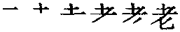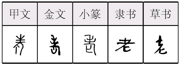 老(lǎo)“ ,考也。七十曰老。从人毛 ,言须发变白也。凡老之属皆从老。”(卢皓切) 甲骨文作 、 、 、 ,皆象一老者倚杖之形。“老”之构意是年老之人。金文作 、 、 、 ,其手杖有些变形。其用例如殳季良父壶:“用亯(享)孝于兄弟婚顜(媾)者(诸)老。”[1]战国包山楚简作 ,郭店楚简作 。传世文献用例如《论语·季氏》:“及其老也,血气既衰,戒之在得。”“老”还可做动词用,“告老”之义。《左传·隐公三年》:“其子厚与州吁游,禁之,不可。桓公立,乃老。” 老部下有九个属字。如“耆”字下云:“老也。从老省,旨声。”又如“孝”字下云:“善事父母者。从老省,从子;子承老也。”“孝”是会意字。 老lǎo(6画)