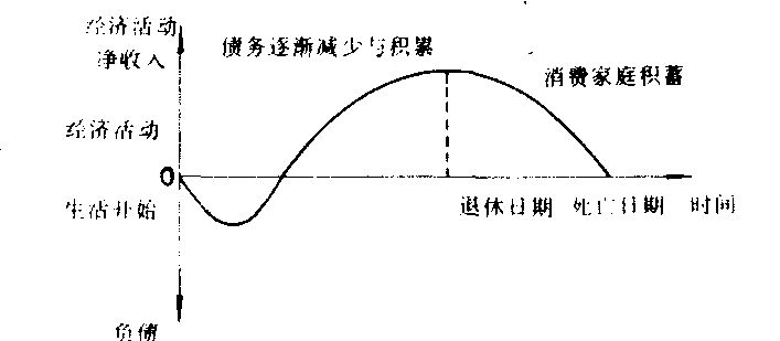老年行为与过去相比,因为改变了社会、经济环境和心理状态,必将得出较前不同的解释。大致可概括为三种模式,即生命周期行为模式、代际行为模式和短期行为模式。生命周期行为模式常用于各种经济研究的参考。由50年代美国的布律贝格和莫迪格利亚尼提出,后来这一模式的定义逐渐与米尔同弗雷德曼主张的永久性收入模式相混淆。它主要着眼于老年人的财政储备,即储蓄或家庭财产积累。大意为:在生命周期初,为保证其消费水平的最佳状态要负债,但时间不长收入将超过其消费水平,在第一阶段可使债务逐渐减少,第二阶段开始有积蓄,以维持今后生活水平为前提开始置备家产与储蓄。如果个人进行了科学的预测,那么在其生命结束时,家庭积蓄全部被消费掉。用图表示如下: