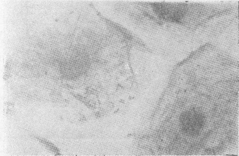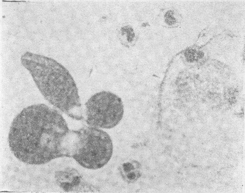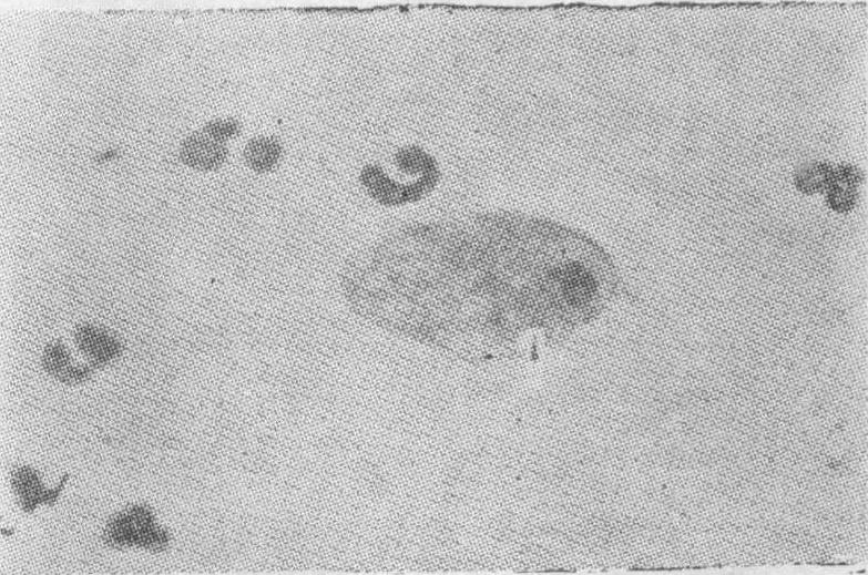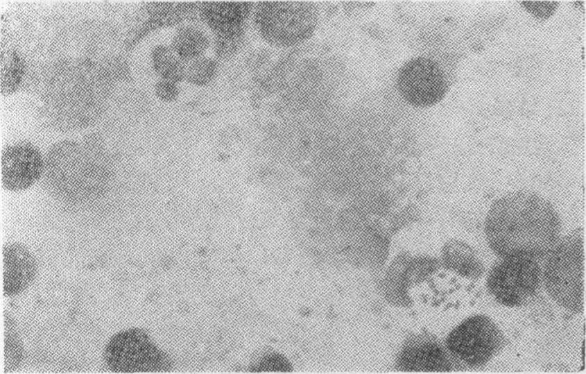 扁桃体小窝涂片,鳞状上皮细胞内有细菌×950