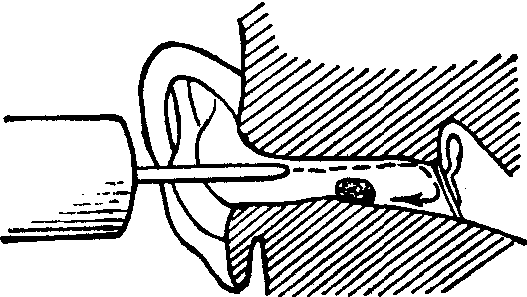 释义 | 耵聍栓塞ceruminal impaction耵聍腺分泌旺盛致耵聍排出过多阻塞外耳道、叫耵聍栓塞。栓塞耳可有耳闷、耳鸣、听力减低等。通常用耵聍钩将耵聍取出、症状消失。 耵聍栓塞因耵聍腺分泌旺盛,产生的耵聍和进入外耳道内尘土等混合积成团块,日久造成的耳道阻塞。表现有耳鸣、耳闷及耳聋。治疗予以取出。 耵聍栓塞impacted cerumen系由于耵聍腺分泌过多,耵聍呈棕黄色油蜡状不易排出,凝结成块而阻塞外耳道。其原因常为外耳道皮肤慢性炎症,致耵聍腺分泌旺盛。此外,外耳道狭窄、畸形、瘢痕形成、皮肤增厚、异物存留以及老年人肌肉松弛致下颌关节运动无力等,均可使耵聍排出受阻而造成栓塞。可先将耵聍软化,然后用器械取出,或采用外耳道冲洗法取出。 耵聍栓塞 耵聍栓塞耵聍即“耳屎”或“耳垢”,为外耳道软骨部皮肤耵聍腺的分泌物,具有保护外耳道皮肤及粘附灰尘、小虫等异物的作用。正常外耳道皮肤表面附有一层极薄的耵聍,暴露空气中干结成淡黄色薄片,在咀嚼、张口等下颌关节运动中自行脱落排出。如耵聍分泌过多,呈棕黄色糊状,凝结成块,阻塞外耳道,称耵聍栓塞。 冲洗时体位 注射器头贴于外耳道口上部外耳道冲洗法 外耳道冲洗法: 适用于外耳道深部不易取除的碎软耵聍或已经软化的耵聍栓塞; 有鼓膜穿孔或有耳漏史而疑有鼓膜穿孔者忌用。冲洗法亦适用于去除某些外耳道异物。冲洗时患者取坐位,头略偏对侧,使患耳稍向上,同侧颈及肩部垫以治疗巾,用弯盘紧贴于耳垂下颈部皮肤,以接受冲洗时回流的水液 (见图)。操作者将耳郭提起,拉直外耳道,以耳冲洗器将温水对外耳道后上壁注入,注意用力不可过猛,也不可将冲洗器头紧塞外耳道内,以免水液不能外流而胀破鼓膜,更不可对鼓膜冲水。水温须与体温相近,过冷或过热均可引起眩晕。冲洗完毕,即用消毒棉签将外耳道擦干,并用70%酒精消毒外耳道。检查外耳道及鼓膜,如有损伤,应及时处理。耵聍如一次冲洗不净,可继续滴药后冲洗,至干净为止。 ☚ 耳郭化脓性软骨膜炎 外耳道异物 ☛ 耵聍栓塞 耵聍栓塞ceruminal impaction由于耵聍腺分泌过多,耵聍呈棕黄色油蜡状不易排出,凝结成块阻塞外耳道。常因外耳道皮肤慢性炎症,致耵聍腺分泌旺盛所致。此外,外耳道狭窄、畸形、瘢痕形成、皮肤增厚、异物存留以及老年人肌肉松弛致下颌关节运动无力等,均可使耵聍排出受阻而造成栓塞。多伴有耳道肿胀、糜烂或溢脓,可致听力减退。可用油剂将耵聍软化,然后用器械取出。 ☚ 耵聍 鲁代征 ☛ |