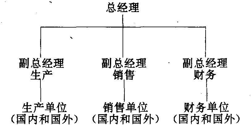 在职能结构中,企业总部领导层的责任是依据管理职能划分的,每一个部门的主管都同时负责国内和国际业务。如销售部不仅负责国内市场的销售,而且对企业在国际市场的销售实行直接控制。此外,销售部还负责与企业所属的生产部门进行销售管理方面的协调工作。生产部通常对本企业设在国内的工厂进行产品选类控制,并负责制定产品在国际市场上的标准化水平,进行产品的质量控制和新产品的开发研制以及对国外子公司进行综合生产管理等。管理职能结构如图所示: