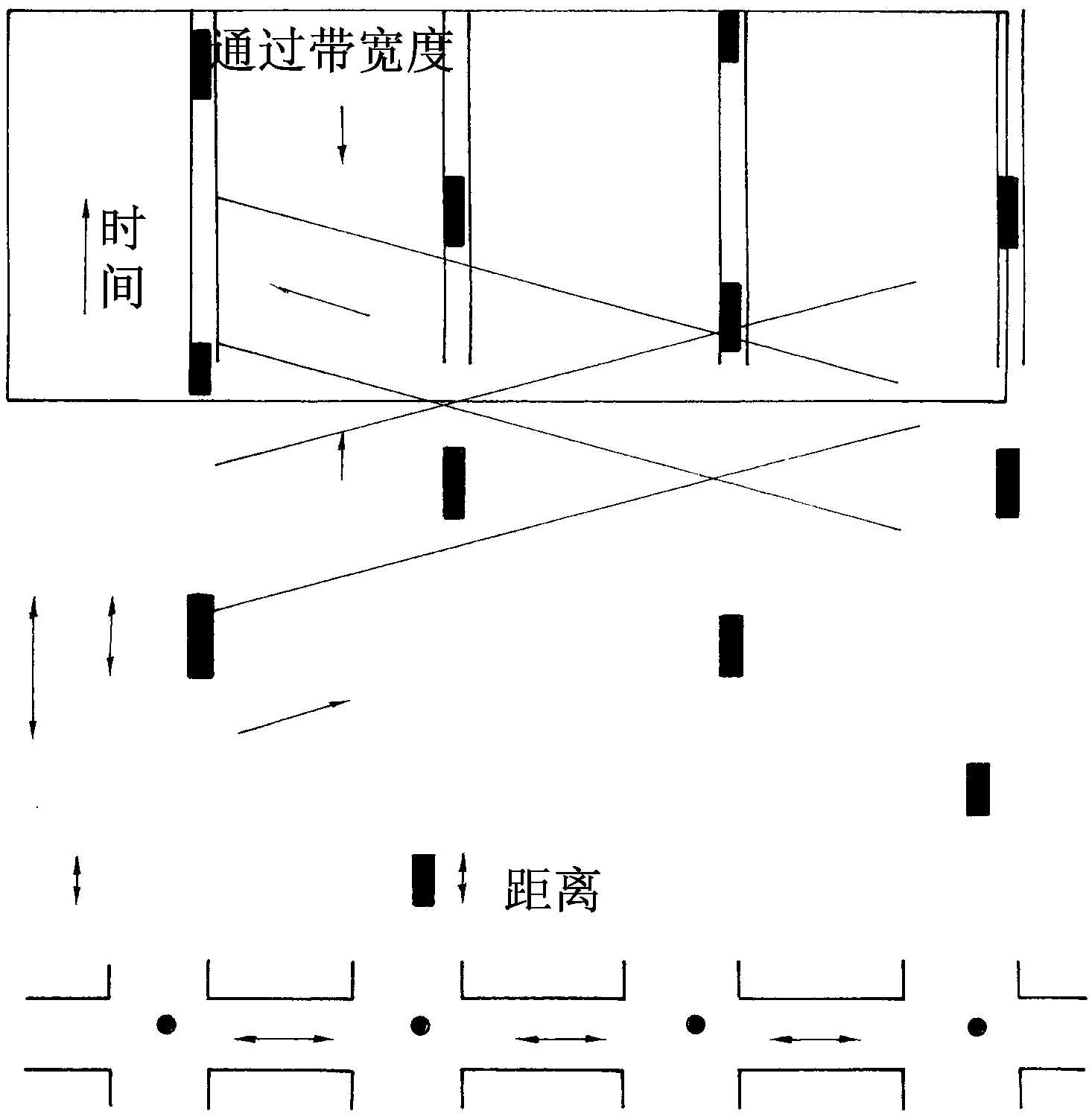 又称“联动交通信号时空图”。线控制交通信号配时方案坐标图。如下图所示。一般把交通信号配时绘作纵坐标,交通干线路口间的距离绘作横坐标,图上的斜率表示交通干线的运行车速,通过带宽度表示通过带内可供车辆行驶的时间间隔;相位差表示绿灯信号起始的时差。绘图前,需对信号控制范围的各个交叉路口作交通流量、流向、排队等调查,分析各交叉路口预期交通量的最佳周期时间,最大交通量的关键路口所需的周期时间,计算关键路口各不同相位的有效绿灯时间、实际绿灯时间、绿灯间隔时间,其他路口的最小实际绿灯时间,次要道路交通信号相位的最短有效绿灯时间,以及线控制范围运行车速与道路条件、交通流量、流向关系的分析与计算。