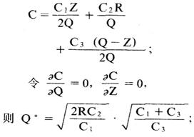 定量与定期补充订货,允许缺货但不设置安全库存量的确定性模型。 模型的假设条件,除允许缺货外,其它条件都与EOQ模型相同。在允许缺货条件下,一个库存周期内有两种状态,坐标轴上面的大三角形是库存有现货期间T1,这期间的最大库存量为Z,每日需求量由库存现货予以满足,倒立的小三角形表示缺货状态,缺货期间为T2,缺货数量是Q-Z,由下一个周期补充库存时来填补,如下页上图。 设模型参数R、C1、C2同EOQ模型,C3为单位产品日缺货费用;T为库存周期,T=T1+T2;Q为每批订货数量。按库存总费用最小的准则,确定最佳订货批量Q*。 对T库存周期内平均总费用(保管费、订货费和缺货费之和)公式,求对Q和Z的偏导数,并令其等于零,即    |
