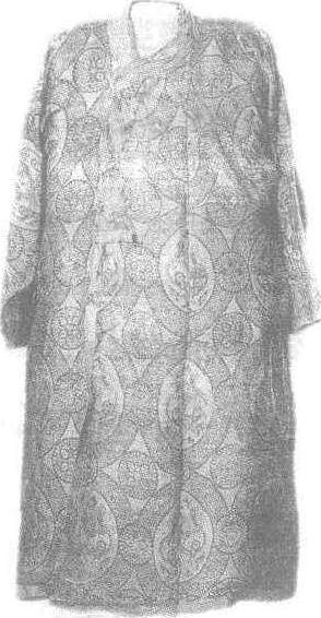 宋代制品,1953年在新疆维吾尔自治区若羌县阿拉尔墓葬中出土,现为北京故宫博物院收藏。身长138厘米,肩袖通长194厘米,袖口宽15.5厘米; 半掩襟、交领、窄袖,后身高开禊,其形制便于骑射,属胡服,与汉族袍服明显不同。纬锦面料,黄地,黑、绿、白地花。主纹在椭圆形的大联珠圈内,中为花树,两侧是背向的双鹫。大联珠圈的交切处和隙地饰以内填四叶和四鸟团花的小联珠圈。大小联珠圈均由小巧的圆点围成。图案设计奇特,一般认为,是北宋遗物。