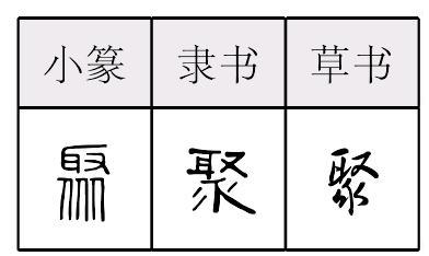 【提示】耳,中间两横宋体与左右两边相接,楷体与左边相接,与右边相离; 位于字左时,末笔横改提。又和 的末笔原本都是捺,为避重捺,又的末笔捺改点。 下面是 , 不是𧰨。 *聚jù14画 耳部 会合;集合: ~餐|~会|~宝盆|~精会神。 聚jù战国以来的形声字。从众(变形),取声。声母演变如且沮(jǔ)咀(jǔ)、秋揪例。会合,集合义。如:大家聚在一起|聚少成多|欢聚。 聚★常◎常