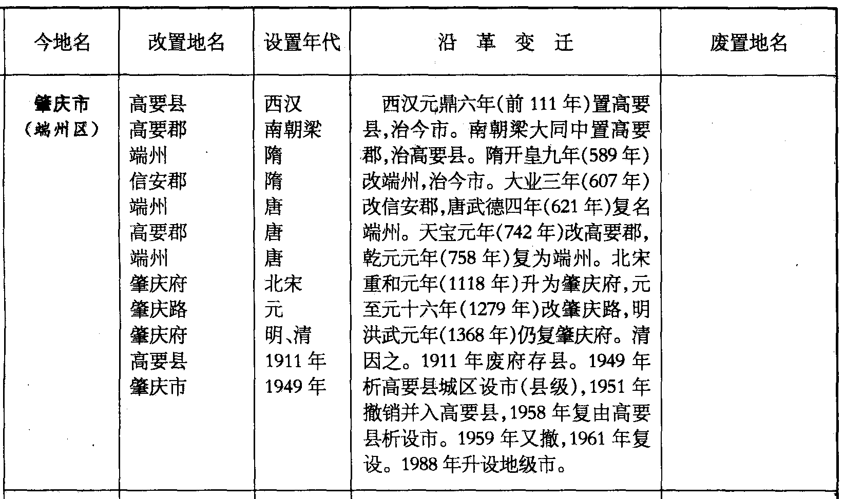 西汉元鼎六年(前111年)置高要县,治今市。南朝梁大同中置高要郡,治高要县。隋开皇九年(589年)改端州,治今市。大业三年(607年)改信安郡,唐武德四年(621年)复名端州。天宝元年(742年)改高要郡,乾元元年(758年)复为端州。北宋重和元年(1118年)升为肇庆府,元至元十六年(1279年)改肇庆路,明洪武元年(1368年)仍复肇庆府。清因之。1911年废府存县。1949年析高要县城区设市(县级),1951年撤销并入高要县,1958年复由高要县析设市。1959年又撤,1961年复设。1988年升设地级市。