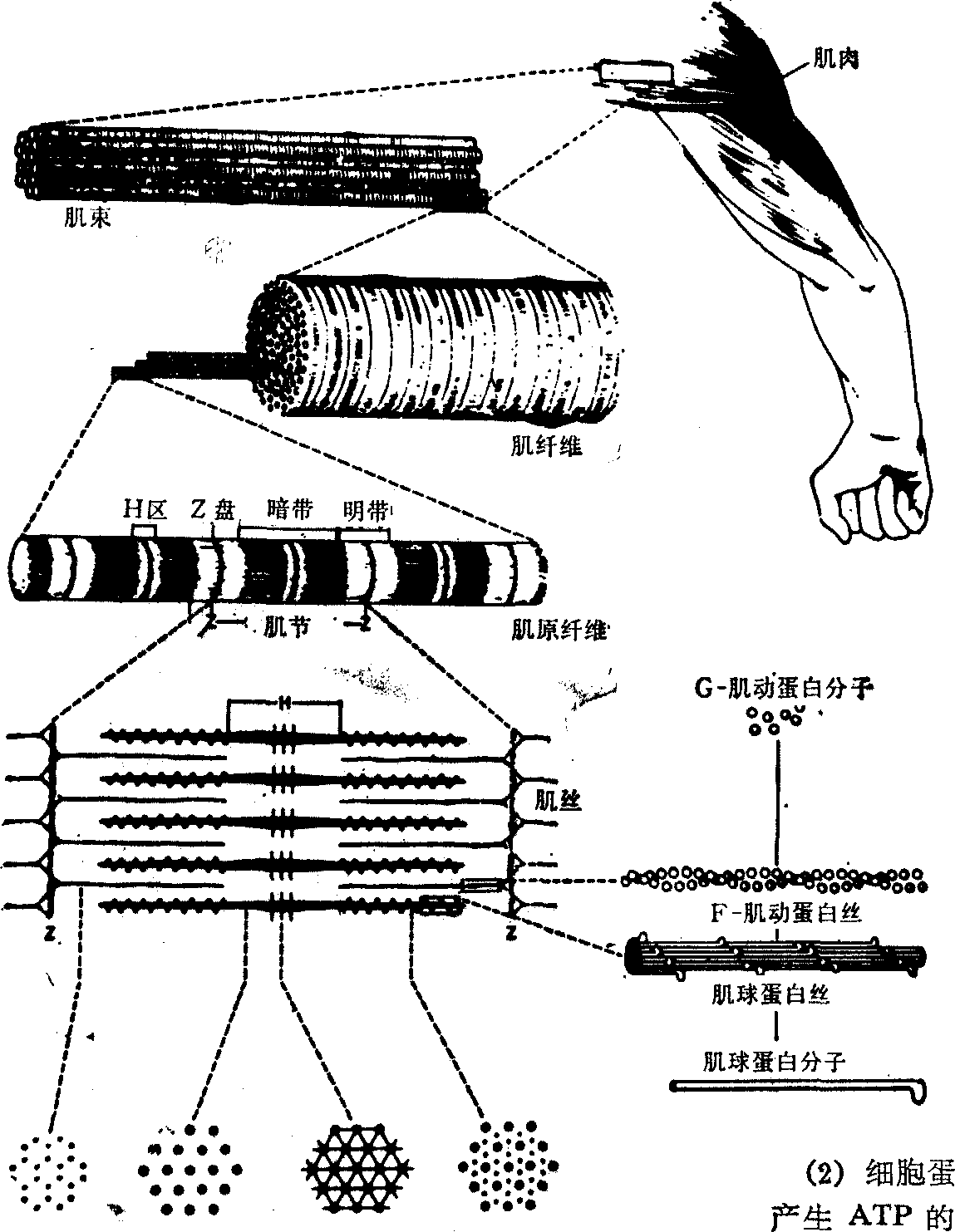 释义 | 肌原纤维myofibril动物骨骼肌细胞内与收缩功能有关的细长丝集合体。直径1~2μm,平行于肌纤维长轴。其上显示明暗相间的带,称横纹。暗带易为铁苏木精等深染,也称A带;明带浅染,也称I带。明带中央一深色线称Z线或间线,暗带中部有一浅染的H带,带中央深色线为M线或中线。两相邻Z线间的一段肌原纤维称肌节。电镜观察,肌原纤维由两种纤细的粗、细肌丝构成。二者各居一定位置,又互相穿插。明带只有细丝,暗带兼具两种,但中央H带只有粗丝。中线对粗丝起固定作用,细丝则固着在间线两侧。骨骼肌肌原纤维被肌浆网、线粒体和T小管等分隔,界限分明,而心肌肌丝集合体分隔不完全,故心肌无独立的肌原纤维。 肌原纤维myofibril系骨骼肌纤维中含量最丰富的成分。占肌细胞浆中的一半以上。此纤维呈细丝状,直径约为1~2μm,相互平行的纵列于胞浆中。在横切面标本上,呈细粒状,均匀散布在胞浆中,有时可见到肌原纤维集结成多角形的小区,其间被胞浆分隔。在电子显微镜下观察,每条肌原纤维又是由更微细的肌微丝组成的。根据肌微丝的长度和化学成分又分为两种:一种直径为50Å,长度为2μm左右,由肌动蛋白分子形成的微丝,叫肌动蛋白微丝;另一种直径为100Å,长度1.5μm左右,由肌球蛋白分子形成的微丝,称肌球蛋白微丝。 肌原纤维肌细胞内沿细胞长轴平行排列的细丝。骨骼肌和心肌等横纹肌,其肌原纤维有色深的暗带和色浅的明带交替排列,各条肌原纤维的暗带和明带,整齐地位于同一平面上,使肌纤维呈明暗相间的横纹。平滑肌纤维则不显横纹。 肌原纤维myofibril是由肌丝集合成束、外有肌浆网包绕而成。骨骼肌中有典型的肌原纤维,心肌中的肌原纤维不完整,平滑肌不形成肌原纤维。肌原纤维在肌浆中平行排列,纤维之间有大量的线粒体。横纹肌的肌原纤维有明暗相间的横纹,是肌原纤维中粗、细肌丝按一定规律排列的结果。 肌原纤维 肌原纤维骨胳肌及心肌细胞,在电镜下可见密集排布着数百乃至数千条纵行的细纤维——肌原纤维。肌原纤维可沿细胞长轴缩短与伸长,是产生收缩的结构。肌原纤维的直径约为1~3μm,由许多粗丝和细丝以一定重复结构平行排列构成(见图)。 肌原纤维中组细丝的排列图 目前有一些证据表明在某些动物的肌肉中存在第三种肌丝——T丝,其直径为2.5nm,介于Z线之间贯穿整个肌节。在高度伸长的肌节可以看到它在肌球蛋白丝与肌动蛋白丝之间纵向搭桥。它的作用可能是当肌肉高度伸长以至粗、细丝毫无垂直重叠时保持肌节完整不散并维持一定的张力。它可能是由肌微纤维蛋白组成。从去肌动球蛋白的肌肉残渣中可将其提取出来。 ☚ 肌管系统 肌肉蛋白质 ☛ 肌原纤维 肌原纤维myofibril系肌浆中含量最丰富的成分。此纤维呈细丝状,沿细胞的长轴平行排列,在光学显微镜下显有纵纹。每条肌原纤维都有明暗相间的横纹或带,各肌原纤维的横纹排列在同一水平,所以整个肌纤维显示有明暗相间的带。肌原纤维由更细微丝-肌丝组成。 ☚ 肌动蛋白 肌纤蛋白 ☛ 肌原纤维muscular(/muscle)fibril;myofibril |