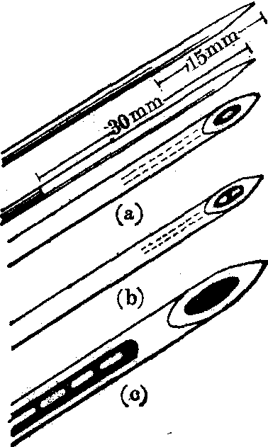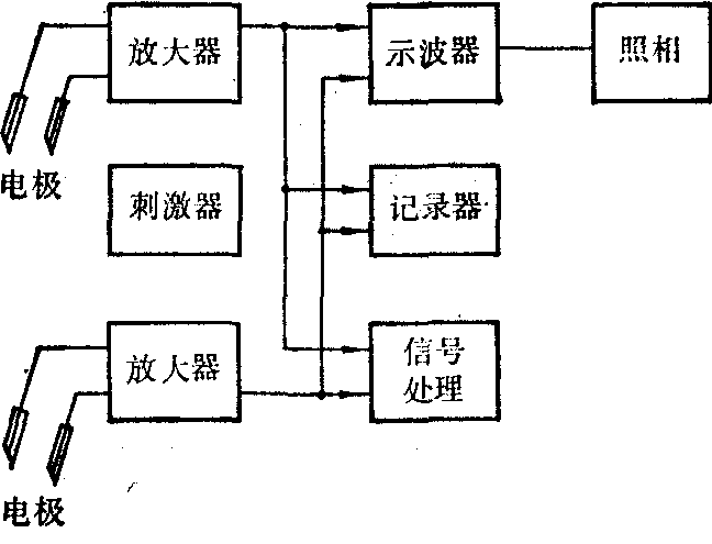 图1 两导联肌电测量装置方框图 (1)肌电的放大: 用肌电电极从人体检测的信号为几μV到几十mV,在记录、显示前需要进行放大。肌电图仪几乎都采用温度稳定性好,对共模信号有较强抗干扰能力的差动放大器。增益一般分为12档,供对不同大小信号测量时选用。放大器输入阻抗为10~100MΩ。由于肌电信号的频谱为10Hz~10kHz,肌电放大器的频响应满足信号频谱的要求。为了检测微弱的肌电信号,放大器折算到输入端的噪声应<3μV(峰-峰值)。 (2) 示波显示: 较早的肌电图仪,是用阴极射线示波器显示肌电图,并在示波器上附加照相装置,可连续或单片地拍摄肌电图。一些新型的肌电图仪,在机内配备了计算机,使示波器具有记忆功能。对某一段感兴趣的信号,可随时“冻结”。也可储存信号,需要时重现出来。 (3)波形记录: 由于肌电信号频谱上限高,频响上限仅为100Hz/s的笔描记录器不适用于记录肌电图。肌电图的记录大多是采用频响较高的紫外线记录器或热阵列记录器。热阵列记录器在记录肌电图的同时,还可记录机内计算机对肌电信号一些参数的计算结果和多种字符。 (4) 刺激器: 刺激器主要用于测量诱发肌电图。肌电检查时需要有良好性能的刺激器。刺激器输出为0.1~1ms宽度可调的矩形脉冲、重复频率可调节的连续脉冲、重复频率及持续时间都可选择的序列脉冲三种形式。刺激器采用恒压输出时,由于人体组织阻抗变化,会引起刺激强度的改变。采用恒流输出有明显的优点,刺激强度不受人体组织阻抗的影响,操作比较方便。 肌电电极 肌电电极用于从人体拾取肌电信号。它应具备生物测量电极的一般性能,但在结构上有自己的特点。肌电测量时,应根据不同的目的,使用不同的电极。电极一般分为表面电极和针形电极两类。 (1) 表面电极: 表面电极用于从皮肤表面检测一个肌群的肌电信号,它用极化电压较小的银或不锈钢等材料制成,形状多为小圆形或方形。表面电极使用简便,适于记录诱发电位和运动时的肌电信号。 (2) 针形电极: 要记录深部肌肉的动作电位或选择性地研究单个运动单位的电活动,应使用针形电极。针形电极有以下几种。 ❶单极针形电极:它有针形和同心针形两种〔见图2(a)〕。在不锈钢针上喷涂一层绝缘材料,针尖部分裸露,就成了单极针形电极。记录肌电时,可用类似针形电极或表面电极作为辅助电极,插入附近皮下组织或置于皮肤表面。它记录的是针形电极与辅助电极之间肌纤维的活动电位。铂金丝或不锈钢丝用环氧树脂绝缘处理后,插入钢制管内,末端磨成斜面,尖端裸露,便成为同心针形电极。芯电极为信号电极,针管接地,一般针管外径为0.3~1mm。用于记录骨胳肌动作电位的电极外径为0.5~0.6mm,芯极斜面面积约为0.07mm2。同心针形电极记录的是芯电极与针管之间小范围内肌纤维的活动电位。它比针形电极有较强的抗干扰能力,临床上最常采用; ❷双极针形电极:在钢制针管内插入两根经过绝缘处理的铂金丝或不锈钢丝,两丝间距约为100μm。末端磨成斜面,就成为双极针形电极。针管为地电极,两根金属丝为信号电极〔见图2(b)〕。这种电极记录的是两个芯极之间很小范围内肌纤