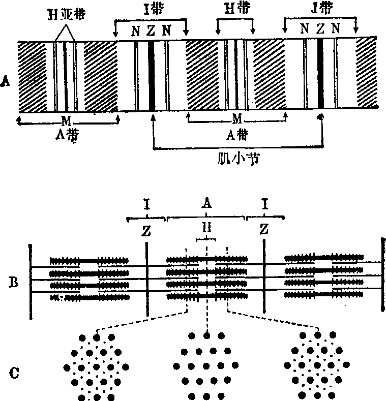释义 | 肌肉收缩的生物物理学 肌肉收缩的生物物理学肌肉的主要功能是收缩作功。在横纹肌(包括脊椎动物的骨胳肌、心肌等)中,它是由肌细胞特有的结构肌原纤维承担的,是构成肌原纤维两种主要的蛋白——肌球蛋白和肌动蛋白分子相互作用的结果。涉及肌肉收缩的生物物理问题主要有: 骨胳肌肌原纤维带示意图 脊椎动物骨胳肌肌原纤维的粗肌丝基本上只含有肌球蛋白,细肌丝除其主要组分肌动蛋白外,还有原肌球蛋。白和原宁蛋白组。 肌球蛋白分子具有三磷酸腺苷水解酶活力,能和肌动蛋白分子结合,分子的外形大体上呈一端带有两个球状结构头部的棒状物。它由两根多肽链组成,它们大部分复合成为分子的棒状部分,而每一根多肽链都在其一端形成一个球状区。在每根粗肌丝的中点,两个肌球蛋白分子以没有球状结构的端头互相连接,然后向肌丝的两个端,头以分子棒状部分中长约50nm的一段直线连接延伸。分子棒状结构的剩余部分加上两个球状结构部分,则向外突出成为横桥。肌动蛋白是一种球蛋白,在水溶液中分子大体上呈长轴约为5.4nm的椭球体,在一定浓度的盐溶液中易于直线聚合。两根聚合后的肌动蛋白丝也复合成为麻花状结构,原肌球蛋白和原宁蛋白分子则位于这个结构的两个凹槽中,两者相间排列。 目前认为,在肌纤维静息时,原肌球蛋白在细肌丝凹槽中的位置正好挡在由粗肌丝伸出的横桥和细肌丝中的肌动蛋白之间,使两者不能互相作用。肌纤维活动时,由于肌浆钙离子浓度升高,通过原宁蛋白使原肌球蛋白的位置发生改变,横桥和肌动蛋白分子得以接触相互作用,横桥发生摆动,将细肌丝向粗肌丝间隙中拉曳,产生张力。 收缩系统的力学性质 静息肌肉稍微受到张力时,呈现类似橡皮的弹性性质。温度上升,张力减小;温度下降,张力加大,即受热时缩短,冷却时伸长。肌肉所受张力较大时的情况则相反。这时肌肉收缩性质和正常弹性体相同。肌肉的负荷越大,最大收缩速度越慢,两者的关系可以用下式表示: (P+a)(v+b)=常数 式中P为加于肌肉的力,v为收缩速度,a、b为常数。 收缩的热力学问题 肌肉在静息时不断产生热量,活动时产热率增加。 ❶肌肉静息时的产热: 安静的青蛙缝匠肌在20℃时的产热率约为0.002cal/g·min,温度系数Q10约为2.5。这部分产热大体上是由维持肌肉内环境恒定和组成部分不断更新所需的功能活动供给。如果人的肌肉产热情况与此相仿,则在静息时肌肉的耗氧量约占基础代谢的20%左右。在无氧情况下,肌肉产热减少一半,无氧代谢产物积聚。如果缺氧不太严重,肌肉在重新获氧后恢复过程中,可产生额外的热量。 ❷等长收缩的产热: 等长收缩时的额外产热有以下一些: 如激活热,这部分产热在肌肉活动早期出现,和肌肉的张力无关,约为5mj·g-1。它除和动作电位的发生有关以外,主要和肌肉活动早期细胞内钙离子释放和结合的相关过程有关; 以及维持热,肌肉在作强直等长收缩时的另一部分产热,其中相当大一部分也和细胞内钙离子的释放和再积聚的过程有关。 ❸非等长收缩时的产热。一块肌肉接受强直刺激时,如果长度缩短,产热率比静息时大,这部分超过的产热称为缩短热,其产生率和缩短速度成正比。此时肌肉的能量释放率 ![]() ![]() ![]() ![]() ![]() ![]() ![]() 式中P0为等长收缩张力, P为负荷, ![]() ❹舒张热: 肌肉作等张收缩后再作等张舒张,缩短时肌肉对负荷做的功,在舒张时转换成热释放出来。 ❺延迟热: 指肌肉在机械变化结束后,恢复时的产热。 ☚ 视觉过程的生物物理学 生物系统热力学 ☛ |