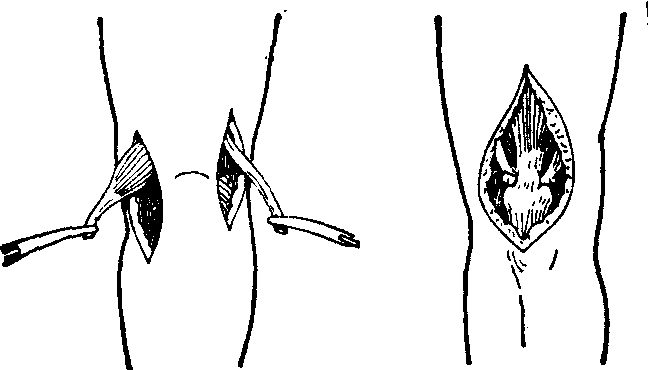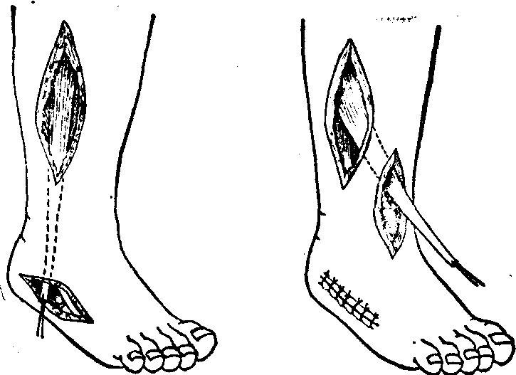 释义 | 肌腱手术 肌腱手术肌腱手术包括吻合术、延长术、移植术、移位术、松解术、固定术和切断术等。 编辫式缝合法 ![]() 鱼口式缝合法 手术操作要轻巧,肌腱的光滑表面及腱系膜要尽量保留,不要乱夹、乱压、乱擦,并用湿纱布保护。遵守无菌操作,以防感染。缝线脱落多由于术后开始练习活动时发生,凡有阻力性的活动,必须禁止。 肌腱延长术 是将肌腱切断或部分切断,予以延长,以矫正由某一束或某一组肌肉挛缩引起的短缩或关节畸形的手术。各种原因引起的肌肉或肌腱短缩,形成关节畸形,影响功能,而该肌本身部分保留收缩功能者,适用肌腱延长术。如 ❶先天性局部肌肉、肌腱、韧带短缩,如马蹄内翻足。 ❷肌肉坏死后瘢痕挛缩,如局限性缺血性肌挛缩,肌肉创伤所致的瘢痕挛缩等。 ❸炎症后肌挛缩,如化脓性炎症形成的瘢痕挛缩等。 ❹肌力不平衡引起的在发育过程中所致的肌肉短缩,如脊髓灰质炎后遗症的某些肌肉短缩,或大脑性瘫痪所致某些肌肉因痉挛而短缩。 ❺医源性原因,如下肢骨折固定后不注意造成的垂足。手术种类及原则: ❶跟腱延长术: 应用于矫正跟腱挛缩引起的马蹄足畸形,分为将跟腱呈“V”形延长及“Z”形延长两种。此术 应在骨关节融合术前进行,注意保护 血管和神经,对大腿肌肉麻痹者,不宜 作此手术,以免膝关节不稳定。 ❷胭 绳肌延长术: 应用于大脑性瘫痪所致 的膝关节屈曲性挛缩的选择性病例, 将股薄肌、半腱肌、半膜肌和股二头肌 腱作“Z”形延长。 ❸肱二头肌腱延长 术: 应用于肘关节屈曲挛缩。将肱二 头肌腱呈“Z”形延长。 ![]() 跟腱“Z”形延长术 肌腱移植术 当某一肌腱因各种原因断裂、缺损、修补时长度不够,取其他肌腱移植的手术。适用范围有 ❶手部屈肌腱在腱鞘内“无人区”的断裂,单纯修补后,常因粘连而丧失滑动功能,因此,主张施行指深屈肌腱游离移植术。 ❷其他部位肌腱缺损,肌腱严重损伤者、瘢痕与周围组织粘连,不能用单纯松解术恢复功能,对陈旧性肌腱损伤后肌挛缩,肌腱回缩不能对合。 ❸利用附近未瘫痪肌肉的移位术以代替瘫痪肌肉的功能时,如移位的肌腱不够长,可用游离腱的移植增补之。如用骶棘肌代替臀大肌,和用伸腕肌代替蚓状肌等。 肌腱移植后,需要健全的软组织保护,如肌腱缝合部位瘢痕组织太多,不可能完全切除或切除后骨关节裸露时,则需移植筋膜以隔离之。 肌腱移位术 当一组或一个肌肉因各种原因引起功能减弱或丧失时,可将邻近健全肌肉的肌腱止点转移到合适地点,就是肌腱移位术。它的肌力作用的方向和重新分配各肌群的作用,使肌力获得较好的平衡,以达到改善功能和预防畸形的目的。应用范围包括脊髓灰质炎后遗症;周围神经损伤引起一组或一个肌肉瘫痪,而神经又无法修复或修复后无效者;创伤所致的肌肉缺损不能修复,而影响功能者; 少数痉挛性瘫痪影响功能者。肌腱移位手术受术者最小年龄应以患儿能与医生合作为准,一般主张在5岁以后。在肌腱转移前,须矫正已存在的挛缩畸形。须先查明肌肉瘫痪情况及产生的各种畸形,然后考虑用那些肌肉去平衡。分离肌腱要仔细,并注意保护支配该肌的神经和血管。转移的肌腱,其通路尽可能取直,以减少阻力。肌腱转移的部位,依畸形而定。如足内翻畸形,则可将止点多靠近腓侧;反之,则多靠近胫侧。新止点固定在骨组织上比较牢靠。术后石膏固定,保持该肌于松弛位。软组织手术固定4~6周,骨性手术固定6~12周。早期功能锻炼,以免粘连。 临床出现下述症状常采用肌腱移位术,其手术种类及要点有: (1)髋关节动力肌群瘫痪: ❶外展肌瘫痪时,可用髂腰肌转移到股骨大转子,但股四头肌肌力必须良好,以免术后屈髋功能丧失。 ❷内收肌瘫痪时,可将腘绳肌起点的坐骨结节转移到耻骨下支。 (2) 膝关节伸肌瘫痪: 如股四头肌瘫痪,肌腱转移是唯一恢复自动伸膝的方法。 ❶常采用股二头肌与半腱肌转移到髌骨。因为步行时先屈髋后伸膝,屈髋时股二头肌及半腱肌均呈紧张状态,有利于伸膝。 ❷也有用缝匠肌与阔筋膜张肌转移者,但效果不如股二头肌与半腱肌转移。行上述两种手术时,臀大肌及腓肠肌的肌力必须良好;膝关节无屈曲或挛缩畸形。有严重髋、踝或足部肌肉瘫痪而不适宜手术者,不能作此手术。 ![]() 股二头肌与半腱肌转移术 (3)足、踝关节周围肌群瘫痪: ❶胫骨前肌部分瘫痪可引起马蹄、马蹄凹弓或马蹄外翻足畸形。 一般采用𧿹长伸肌向第一跖骨转移或合并施行跖筋膜切断术,既能矫正足踝关节功能的不平衡,又可制止畸形的发生。 ❷胫前肌完全瘫痪可引起马蹄凹弓足畸形,可用腓骨长肌向足背移植, 有时须同时施行跖筋膜切断术和𧿹长伸肌后移术,效果确切。 ❸单纯腓肠肌瘫痪可引起严重的仰趾足畸形,可将胫前肌转移到跟骨跟腱上,也有用胫后肌与腓骨长肌移到跟骨上的,此术虽不能完全制止畸形,但对减少畸形是相当有效的。 腓骨长肌向足背转移 (4)肩部周围肌肉瘫痪: 肱二头肌瘫痪引起的功能不全是严重的,虽有完整的前臂及手指,但不能发挥其应有的功能。对此,常将胸大肌转移到桡骨结节上。另有全胸大肌转移术,此法实际上是前一手术的改良,所不同的是胸大肌的胸骨部在肱骨的上端切断,转移到肩胛的喙突上,使该肌更接近肱二头肌的解剖位置。但转移的肌肉必须坚强有力,且前臂及手的肌力需