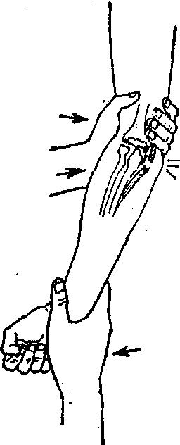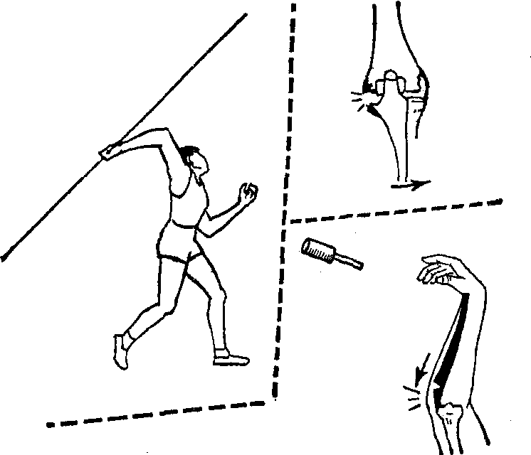 肌肉、韧带损伤或部分撕裂时局部有出血肿胀,周围呈反应性炎症。如反复损伤即变为慢性,尺侧副韧带松弛或出现关节囊及韧带钙化。肌肉附着处可有骨质增生、钙化或骨化。 严重的急性损伤时,肌肉和韧带可单独或同时完全断裂。断端有时嵌入关节。肌肉和韧带同时断裂的联合损伤,伤时多有一过性肘关节侧方脱位或半脱位。处理不当常导致肘关节不稳或复发性肘关节侧方脱位或半脱位。 临床表现为: 肘尺侧副韧带损伤时,重复受伤动作可出现疼痛; 前束损伤时,肘伸直位将前臂向桡侧搬可出现疼痛; 后束损伤时,肘屈曲90°位将前臂向桡侧搬可出现疼痛。在肘的内侧尺骨半月切迹及肱尺关节隙处有压痛。肱骨内上髁炎或屈肌附着点损伤时除局部有压痛外,还有屈腕或前臂旋前抗阻痛。尺侧副韧带完全断裂时局部肿痛明显,前臂桡侧搬时疼痛明显,外搬角度加大,并有松弛开口感。单纯韧带断裂时令病人用力握拳再加桡侧搬时,以上症状消失或减轻。如果仍有肘关节侧搬不稳症状则说明屈肌亦完全断裂(见图2)。 慢性损伤晚期X线摄片可见内上髁脱钙、骨质增生或韧带钙化。肌肉或韧带完全断裂时,于前臂桡侧搬肘的X线正位片可见尺侧关节间隙增宽 (必要时局麻下进行)。 关节急性捩伤后伤肢应停训。24小时后可作理疗,或作强的松龙加奴佛卡因痛点注射。2~3周后可参加训练,但应暂时避免受伤动作。 急性肌肉与韧带完全断裂时应及时手术缝合。陈旧性肌肉韧带完全断裂,已有复发性侧脱位时也需手术,重建尺侧副韧带并同时将断裂肌肉的止点上移。可改进功能,减轻症状。