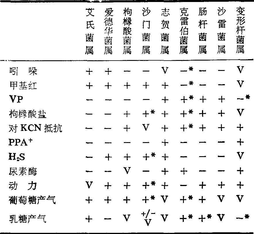 本科细菌多数有周身鞭毛,能运动,但志贺、克雷伯和耶尔森菌属无动力。有些细菌有荚膜,主要是克雷伯菌和沙雷菌。大多数菌均有菌毛,有菌毛的菌株能吸附在宿主及其他细胞上。细菌之间可以通过性菌毛交换遗传因子。在一般培养基上生长良好。不同种类细菌的菌落相似,为光滑、湿润和浅灰色,不易区别。肉浸液中生长呈均匀混浊。生化反应活泼,能分解多种物质,形成不同产物,常用于区别菌属和菌种(表2)。乳糖发酵试验有实用意义,非致病菌一般能发酵乳糖,致病菌则不能。细菌表面有各种抗原,可用血清学反应检查,以供菌种的鉴定和分型。主要表面抗原有O抗原、H抗原和K抗原三种,其他尚有菌毛抗原和共同抗原。 ❶O抗原:即菌体抗原和内毒素,存在于所有革兰阴性菌的细胞壁中。化学成份为脂多糖。耐热,加热至100℃不被破坏。不同菌种的O抗原特异性取决于脂多糖分子侧链末端糖残基的种类和排列。在抗O血清中,有表面O抗原的细菌可凝集成紧密、细小的颗粒,不易摇散。初由病人标本中分出的肠道杆菌均有O抗原,菌落为光滑(S)型。在人工培养基上保存日久后,细菌壁上的脂多糖失去了O特异性侧链,但保留核心多糖类结构,此时菌落变为粗糙(R)型,称做S-R型变异,R菌株的致病力显著低于S型。 ❷H抗原: 即鞭毛抗原,化学组成是蛋白质。不耐热,加热至60℃30分钟即被破坏,乙醇可使之变性。有鞭毛的菌在抗H血清中,呈疏松摇之即散的絮状凝集颗粒。失去鞭毛后,动力随之消失,称做H-O变异。这种变种,有时可见于从病人标本分出的菌株。 ❸K抗原:即荚膜和包膜抗原。二者均位于菌体抗原外围,能抑制O凝集现象。为多糖类,加热60℃30分钟可去除。有荚膜的菌可在显微镜下用特殊染色法观察,包膜则不能,需用血清学方法检测。重要的包膜有伤寒杆菌的Vi抗原,大肠杆菌的K抗原等。荚膜和包膜与细菌的侵袭力有关。 ❹菌毛抗原: 本科中大多数菌种有菌毛。菌毛的数量很多,有抗原性,能干扰O凝集作用。煮沸可破坏菌毛,使细菌呈现O凝集性。 ❺共同抗原(ECA抗原): 存在于细菌表面,有两种形式,一种与脂多糖联结,有免疫原性,仅见于少数菌种中,如大肠杆菌O14型。故常被用于制造ECA抗血清。另一种存在大多数肠道杆菌中的ECA是半抗原,无免疫原性。如提出后,以之致敏红细胞,即可在抗ECA血清中形成间接血凝现象。在严重或慢性肠道感染中,血清中有时可测出抗ECA抗体。有关此抗原的化学组成及与细菌致病的关系目前尚不明。本科细菌不形成芽胞,故易被热力或低浓度化学消毒剂如石炭酸、甲醛、戊二醛、卤化物等所杀死。能耐胆盐和在不同程度上抵抗染料的抑菌作用,此特性已被用于制作选择培养基。耐低温力强,但干燥后容易死亡。在本菌科内及非本菌科细菌之间均可通过转导、溶原性转换或接合转移遗传信息,导致某些特性的改变。这种遗传物质的转移不只是实验室现象,在机体内和外界均可进行,最常见的是耐药性的转移。其他性状如产生毒素、生化反应等特性也可转移,这些在细菌的致病、实验诊断中都有实际重要性。 表2 肠杆菌科中几个主要菌属的常用生化反应 V: 有些菌株阳性,有些阴性 +: 苯丙氨酸脱氨,形成苯丙酮酸 *: 未定型菌株呈相反结果 细菌致病因子有 ❶内毒素:即细胞壁中的脂多糖分子。其毒性成份是类脂A。将纯化的内毒素接种动物,可引起发热、白细胞数量变化、代谢改变等,严重时可导致休克。30%患肠道杆菌菌血症的病人可出现休克,如不及早抢救,死亡率很高。内毒素休克的主要问题是内脏的血供不足和循环衰竭。 ❷肠毒素: 肠毒素是一种作用于小肠壁上的外毒素,通过细胞内cAMP的增高,促进肠粘膜细胞分泌功能,使大量液体进入肠腔。在体外测定肠毒素方法主要是家兔肠结扎法、乳鼠经口灌注、家兔皮肤试验、细胞培养法等方法。 ❸其他因子: 细菌的各种表面结构与致病作用往往有关,如有荚膜的菌能抗吞噬; 伤寒杆菌的Vi包膜抗原能抗吞噬细胞内的杀菌作用;有菌毛的细菌往往能吸附在宿主粘膜表面,有利于细菌穿透表面屏障进入体内。志贺菌、沙门菌和耶尔森菌都是致病菌,其他肠杆菌偶尔引起肠道感染,或是肠道外条件致病菌,即在不利条件下,可以引起肠道外感染,如泌尿道感染、肺炎、脑膜炎、伤口化脓等。大肠杆菌是正常肠道菌群和条件致病菌,但某些菌型能引起肠道感染。不论致病部位如何,这类细菌一旦入血,产生菌血症,就有可能导致内毒素休克,有时后果极为严重。微生物学检查包括从病变部位分离致病菌和从血清中查特异性抗体。 ❶分离与检定病原菌: 当感染部位是肠道时,必须使用选择培养基以抑制正常肠道需氧或兼性厌氧菌的生长,以利分离致病菌。肠道外感染中细菌常为纯培养或接近纯培养,不用选择培养基。分离纯培养后,根据菌落形态、培养特性与生化反应加以检定。有些菌属和菌种,尚可用血清学方法进行确诊与分型。 ❷血清学检查: 少数肠道病原菌,主要是由伤寒或副伤寒杆菌引起的肠热病,从病程第2周起,血清中出现特异性抗体,可用已知菌种检测抗体的效价,以协助临床诊断。治疗以抗生素为主,但由于耐药菌株多,最好用分得的菌株做抗生素敏感试验,以供选择适合的药物。预防肠道感染的最根本方法是改善环境卫生和加强个人卫生教育。少数种肠道感染,如伤寒和副伤寒,可以用菌苗预