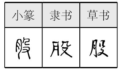 古代名物 > 交通類 > 車輿部 > 車飾 > 股 股 gǔ 指車弓插入蓋斗的一端。因較粗,如人之股,故稱。較細的一端稱“蚤”。《周禮·考工記·輪人》:“參分其股圍,去一以爲蚤圍。”孫詒讓正義引鄭鍔云:“弓之近部者亦謂之股,以其大也。” 股股gǔ〖名词〗 大腿(5)。《子鱼论战》:公伤股。——宋公的大腿受伤了。《晏子不死君难》:枕尸股而哭。——头枕在尸体的大腿上放声痛哭。《苏秦以连横说秦》:读书欲睡,引锥自刺其股。——读书时想睡觉,就用锥子刺自己的大腿。 股gǔ❶ 大腿。《战国策·秦策一》:“读书欲睡,引锥自刺其~,血流至足。”《促织》:“及扑入手,已~落腹裂。” ❷ 不等腰直角三角形中构成直角的较长的边。《梦溪笔谈·技艺》:“又以半径减去所割数,余者为~。” ❸ 事物的分支或部分。白居易《长恨歌》:“钗留一~合一扇,钗擘黄金合分钿。” 股guB9C9 ❶人身体胯至膝的部分:~肱/~骨。 ❷机关企业中的行政机构:保卫~/~长。 ❸集合资金中的一份:~份/~票。 ❹量词:一~暖流/一~正气/一~敌人。 ❺指直角三角形中构成直角的长边:勾~定理。 某种形状物的量 某种形状物的量用于长条形的东西的量:股(一~清泉) 道(万~金光) 茎(一~绿草) 条(一~线) 根(一~筷子) 鞭(打一~) 棍(打一~子) 用于细长圆形的量:管(一~笔) 杆(一~枪) 枝(一~烛) 用于成团或圆球状的东西的量:块(一~糖) 颗(一~豆) 粒(一~药) 丸(一~药) 团(一~面) 锭(一~墨;一~银) 用于片状、方形或其他形状的东西的量:片(一~板) 纸(一~空文) 床(一~被) 面(三~红旗) 扇(一~磨) 抹(一~阳光) 方(一~手帕) 弯(一~新月) 朵(一~云) 枚(一~证章) 用于小的、细丝状的东西的量:缕(一~头发) 绺 ☚ 个体物量 某种事物的量 ☛