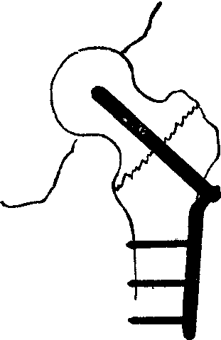❶钉板内固定,根据力学计算,以150°角钉板最为适宜,其所承受的内翻应力等于0,因而可早期承重,促进愈合。