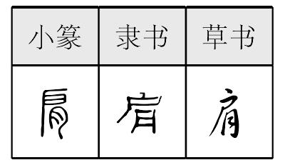 jiān表意,小篆从月(肉),上象人的肩膀连臂之形,本义为肩膀,引申为担负。 【辨析】 以“肩”作音符构成的形声字一般读qián:掮。肩 ; (jiān)从肉,“户”象肩形,非門户字也。 肩 *肩kean[甲骨] [金文] [小篆]《說文》: ,髆也。从肉。象形。 ,俗肩从戶。 (四篇下) 上為肩胛骨之形,為與戶字分別,下附肉塊。 ☚ "> 肰 ☛ 00001000 |