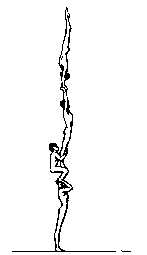 释义 | 肩上半立柱倒立造型 肩上半立柱倒立造型集体项目第1套静力性造型动作之一 。属一人打底的半立柱造型,由于造型架子形似灯笼,故中国俗称“灯笼架”。“下”前后分腿站立,“中1”半蹲站在“下”的肩上,“中2”站于“中1”腿上组成半立柱架,“上”在“中2”的手、头等部位做各种倒立。这种造型与肩上立柱架造型相比,难度较低。但由于半立柱架重心较低,“上”较易在架上完成一系列高难度过渡动作,故往往能以“稳”、以“上”的动作难度取胜。例如:1978年由上海队首次采用“灯笼架高双臂倒立”在中国国内比赛中夺冠。而当时颇有声誉的安徽队因肩上立柱头上单臂倒立不稳而败北;又如在国际比赛中,中国选手多次采用灯笼倒立过渡动作,以稳、难而夺冠。当前男四项目第1套动作造型的发展趋势是造型架子的变化。较多采用“由肩上立柱过渡到肩上半立柱”或“由肩上半立柱过渡到肩上立柱”的变化形式,因此肩上半立柱倒立造型在第1套造型动作中占有重要地位。完成方法:“中1”与“下”对面站立交叉握,“中1”在“下”拉引帮助下,用左脚蹬“下”左腿向上跳起,同时向左转体180°,两脚分别踩在“下”的双肩上,然后“下”直立,用双手扶持“中1”小腿,成双人立柱;“中2”于双人立柱前与之同向站立,两臂上举,“中1”半蹲,两手握“中2”手,协助“中2”向上跳起,两手经侧成支撑,两脚站于“中1”腿上,随之,“中1”两手换扶“中2”双膝,组成肩上半立柱架;“上”面对半立柱架,两手扶“中1”脚,脚踩“下”腿上爬站至“中1”手腕上,随之一手撑“中2”头,一手撑“中2”手,“中2”把“上”托转180°站肩,然后,“上”在“中2”的手上或头上完成各种倒立;动作完成后,“上”向前方跳下,接着“中2”、“中1”依次向前方跳下。练习方法:上3节马步半立柱组架练习;下3节肩上半立柱组架练习;四人组架练习;压架练习;完整练习。注意:练习时,“中2”、“中1”不宜距离过大;由于架子高度增加,上架练习时“上”应用保护带。 ☚ 腿上半立柱双倒立造型 立柱倒立造型 ☛ |