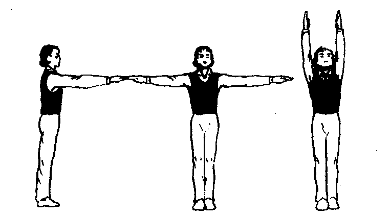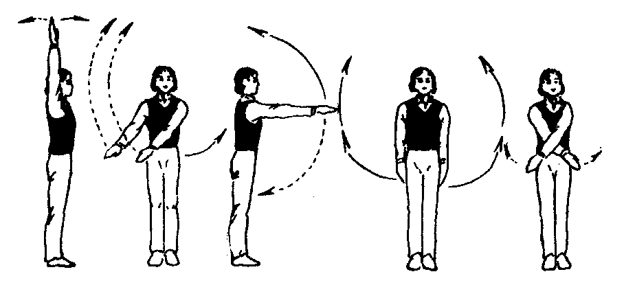 以肩关节为轴,两臂进行各种方向和范围的练习。其主要练习类型有举、振、绕、绕环、挥摆等。举:臂的活动范围不超过180°,并静止在某一部位。如前举、侧举、上举(图2—3—1);侧上举、侧下举、前上举、前下举;前斜上举、前斜下举等。振:肌肉爆发性的收缩,使臂做加速的弹性运动,关节活动范围达到最大限度。振有臂上举后振、臂侧举及下垂后振。振时臂伸直或弯曲。绕和绕环:臂活动范围在180°以上,360°以内称绕,超过360°(含360°)称绕环。根据两臂开始部位不同又分向前、后;向左、右:向上、下;向内、向外的绕和绕环(图2—3—2)。挥摆:两臂进行前、后、左、右钟摆式摆动。人过50岁后易患肩周炎,俗称五十肩,臂不能提,疼痛难受。即使健康老人,随着年龄高升肩关节的活动范围也逐渐受到影响。因此,老年人经常活动肩臂很重要。肩臂练习除上述外,还可以采用压、吊,但要注意肩臂的承受能力,以免拉伤。