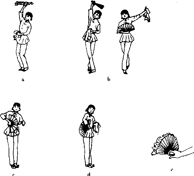 ❸搭扇(亦称凉扇):扇面全开,右手拿扇,拿法同团扇。在头上方,扇面与地面平行,扇骨朝5点 (图a)。