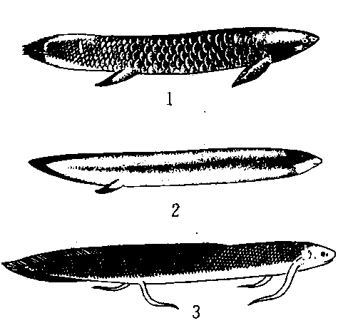 释义 | 肺鱼dipnoans硬骨鱼纲。一群能在干涸环境中用鳔直接呼吸空气的鱼类。平时用鳃呼吸。腭方软骨与头颅愈合。颌为“自接式”。具内鼻孔及泄殖腔。无鳃盖条。背鳍和臀鳍与尾鳍愈合。世界现存仅3属6种。澳洲肺鱼(Neoceratodusforsteri),长达1 m余。体侧扁。鳞大。胸鳍和腹鳍呈桡状。鳔1 个,分布于澳大利亚昆士兰。美洲肺鱼 (Lepidosirenparadoxa),体呈鳗形,鳞微小,隐埋皮下,产于南美。非洲肺鱼有4种,其中一种称原鳍鱼 (Pro-topterus annec-tens),体细长,鳞小,胸鳍和腹鳍退化成带状,鳔2个,分布于非洲河流中,河水干涸时,蛰伏于泥底。肺鱼是珍贵观赏鱼类,具经济价值。 肺鱼 1.澳洲肺鱼 2. 美洲肺鱼 3. 非洲肺鱼的一种 |