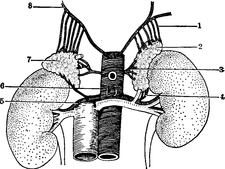 释义 | 肾上腺shèn shàng xiàn一种内分泌腺。也称肾上体或副肾。1919年汤尔和译《诊断学》下卷:“肾上腺,即副肾。”1942年乔树民《内科学·内分泌腺病》:“人体之主要内分泌器官凡六: 一曰大脑垂体,二曰甲状腺,三曰副甲状腺,四曰肾上腺,五曰胰岛腺,六曰性腺(睾丸或卵巢)。” 肾上腺adrenal gland哺乳动物肾前方由皮质和髓质构成的复合内分泌腺。在许多鱼类,两种组织是分开的。皮质来源于中胚层,分泌多种类固醇激素; 髓质来源于神经外胚层,因其细胞可用铬酸盐染成棕黑色,故又称嗜铬组织,分泌儿茶酚胺激素,包括肾上腺素和去甲肾上腺素。 肾上腺的比较 (a) 板鳃类; (b)硬骨鱼; (c) 有尾类; (d) 无尾类(e) 蜥蜴; (f) 鸟类; (g) 哺乳类 哺乳类的肾上腺 皮质和髓质有明显的界线,其位置和两种成分的含量随动物种类而有不同。 哺乳动物的肾上腺组织结构 肾上腺实质的外周部为皮质,深部为髓质。其外包有结缔组织被膜,伸入腺实质形成小隔,血管和神经沿小隔进入腺组织。 皮质 根据细胞形态和排列的不同,皮质由表层向内可分为三个区: ❶多形区。细胞排列成团状和索状(反刍类)、弓状(马属和食肉类)或不规则形(猪);马的多形区细胞呈高柱状,其他动物的很小,核小,染色深,胞质染色均匀,内有类脂小滴。 ❷束状区。细胞索呈辐射状排列,索间有毛细血管和少量的结缔组织; 细胞呈多边形,胞核较大,染色较浅,胞质内细胞器较丰富,并含有许多脂滴。 ❸网状区。细胞索互相吻合形成网状,索间有宽大的窦状毛细血管。细胞呈多角形与束状区的相似,但脂滴较少,褐色素较多,胞核染色深并常固缩。此区不很活跃,细胞处于退化状态。皮质部的细胞分泌盐皮质激素和糖皮质激素,前者能维持肌体内电解质和水的平衡,后者参与蛋白质、脂肪和糖类的代谢; 此外,还能分泌少量的雌激素和雄激素。皮质激素对生命至关重要,切除皮质可导致死亡。 髓质 与皮质的网状区参差相接,细胞排列成束或团,并相互连接成网,主要由嗜铬细胞组成,其间有少量的毛细血管和结缔组织。嗜铬细胞较大,多边形,核圆形位于细胞中央,胞质一般呈弱嗜碱性。多数哺乳动物的嗜铬细胞可分为两种:❶肾上腺素细胞,胞体较大,嗜铬性较弱,分泌颗粒含有肾上腺素; ❷去甲肾上腺素细胞,嗜铬性较强,分泌颗粒含有去甲肾上腺素,髓质中还含有少数多极的交感神经节细胞,单个或2~3个成群分布。肾上腺素能增加心率和输出量,提高耗氧量及基础代谢率,去甲肾上腺素则能引起血压明显升高。 肾上腺的血管分布和神经支配 肾上腺动脉在被膜内形成小动脉网后,大部分在皮质内分支成窦状毛细血管进入髓质,一部分动脉贯穿皮质直接进入髓质,最后在髓质汇集成一条中央静脉出肾上腺。肾上腺的神经支配来自交感神经,大部分进入髓质,以节前神经纤维直接与嗜铬细胞接触。 肾上腺adrenal gland动物体内分沁肾上腺素和肾上腺皮质激素等激素的内分泌器官。在哺乳动物成对存在,位于肾脏前端。外有结缔组织被膜,腺实质周边部分为皮质部,中央部分为髓质部。皮质部起源于中胚层,较厚,根据细胞的排列形式,从外向内分为多形区、束状区和网状区(见“肾上腺皮质”)。髓质部起源于外胚层,体积较小,腺细胞具嗜铬性,称嗜铬细胞,排列成团索状,分泌肾上腺素和去甲肾上腺素。在低等脊椎动物,皮质部和髓质部常互相分离,分散分布。 肾上腺肾上腺平均重量,男性左肾上腺为7.17 g,右肾上腺为7.11 g;女性左肾上腺为7.20 g,右肾上腺为6.86 g。 肾上腺 肾上腺shenshangxian人体重要的内分泌腺之一。位于肾脏上方,左右各一,共重10~18克,左侧呈半月形,右侧为三角形。肾上腺外包被膜,其实质由外围的浅黄色皮质和中央的棕色髓质两部分组成,二者比例约为10:1~20:1。肾上腺皮质和髓质实际上是完全不同的两个腺体,皮质发生于中胚层,是腺垂体的靶器官;髓质发生于外胚层,可视为神经系统的延伸,相当于一个交感神经节。肾上腺皮质分为3层,从外向里分别为(1)球状带:细胞排列成球状,主要分泌以醛固酮为主的盐皮质激素;(2)束状带:细胞平行排列,形成较宽的伸向髓质的长索状,主要分泌以皮质醇为主的糖皮质激素;(3)网状带:细胞排列成网状,分泌少量性激素。肾上腺皮质激素是维持生命活动所必需的,对物质代谢、水盐平衡的调节和应激反应等有重要的作用(参见“肾上腺皮质激素”)。肾上腺髓质在皮质内部细胞排列成索状,其间有丰富的血窦。实际上它是交感神经节迁移到皮质中演化而成的。由于髓质细胞内的颗粒可与铬酸盐作用,呈现棕色,故又称为嗜铬细胞,是分泌和贮存肾上腺素和去甲肾上腺素的场所。肾上腺髓质激素有加快心跳、使血管收缩、升高血压等生理功能(参见“肾上腺髓质激素”)。许多种肾上腺激素及其类似物已作为药物应用于临床。 ☚ 呆小症 肾上腺皮质激素 ☛ 肾上腺 肾上腺shenshangxian内分泌腺之一。黄色,位于左、右肾的上方 (见图),左侧的肾上腺呈半月形,右侧的肾上腺呈三角形。腺实质分两部分:外周部分为皮质,占腺体的90%,中心部分为髓质,占腺体的10%。肾上腺皮质分泌的激素主要调节水与电解质的代谢与平衡,调节糖、脂肪和蛋白质的代谢,调节性器官的发育和第二性征的发育。肾上腺髓质分泌的激素与血压的升高、淋巴系统及心脏血管系统的兴奋、维持体温等都有较密切的关系。若肾上
