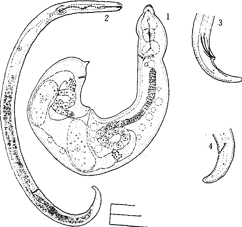 重要病原线虫 在肾形线虫属中,肾状肾形线虫是唯一重要植病线虫。此虫广泛分布于热带地区,有100多种寄主植物,包括蔬菜、玉米、棉花、香蕉、柑橘和杧果等许多栽培植物和果树。中国报道的新寄主还有菊花和剑兰。肾状肾形线虫侵害寄主根部,引起病部局部坏死,根皮脱落,导致植株生长不良和产量下降。当肾状肾形线虫和镰刀菌和轮枝孢等病原真菌同时侵染某作物时,所引起的萎蔫病发生率比没有线虫存在时高。轮作和使用杀线剂可有效控制该线虫为害。 肾形线虫属Rotylenchulus垫刃目的小型线虫。长0.5 mm或者更小。雄虫、年轻雌虫和幼虫线形,大小相似,死态弓状至螺旋形。成熟雌虫异常膨大,常呈肾形,有较粗的头颈部和带穗状端突的短尾。各虫态唇区高,不缢缩。幼虫和雌虫唇架重角化。口针长为唇宽的2~3倍,基部球清晰。食道垫刃型。背食道腺在基部球后约一个口针长度处开口,食道腺叶状,覆盖肠端。雌虫双向双生殖管,先端回折两次(年轻雌虫)或高度卷曲(成熟雌虫);阴门约在2/3体长处。雄虫唇架、口针及食道发育差,交合刺细,交合伞小,伸展至近尾端,尾长锥状,有无色尾端。卵产于卵囊中。雄虫不取食,主要以年轻雌虫前部半内寄生于植物根系。固定取食,取食点可因不同寄主而异,包括根系皮层、中柱鞘或韧皮部。在取食过程中保留于根表的虫体后部逐渐膨大为成熟雌虫。受害根系及其地上部生长受抑制,病部也可变色。本属约有10种,主要虫种有肾形线虫(R.reniformis Linford etOliveira)和微细肾形线虫〔R.parvus(Williams)Sher〕。 |