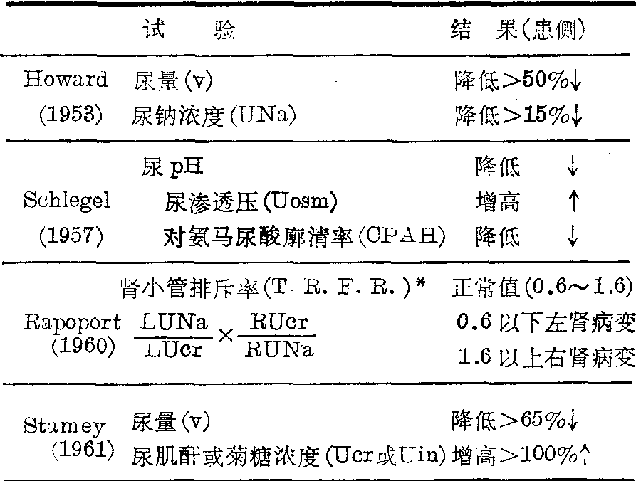 肾小球旁器(近球装置)的病理变化: ❶球旁细胞。产生肾素。 ❷致密斑。是一个感受体,高钠通过致密斑可刺激球旁细胞促使肾素分泌增高。 ❸球外系膜细胞 (近血管球细胞)。是神经末梢小体有控制肾脏分泌的功能。 ❹Bec her门旁细胞群。对葡萄糖、磷酸盐、氨基酸的吸收和合成有关。病理所见为细胞增多,主要在以上各部分中。 肾血管的病理变化: ❶动脉粥样硬化,见于老人,男性多于女性。肾动脉梗阻,多在近端2cm处,偶尔累及动脉远端或其分支。动脉内膜,形成粥样斑块,可沿血管壁蔓延,使管腔狭窄和内膜破坏。肾动脉粥样硬化往往是全身性血管病变的局部表现。 ❷纤维肌肉增生,常见于青年病人,女多于男。肾动脉损害发生于中1/3和远段1/3,常延及分支。 ❸大动脉炎。当原发性腹主动脉炎累及分支包括肾动脉时则产生肾血管性高血压。产生这一病理变化的病因不明,认为与免疫反应有关。在我国这类病变远比前两型多见。 ❹少数病例由肾动脉瘤、肾梗死、肾动脉损伤、肾动静脉瘘等病变引起高血压。 临床类型 ❶高肾素型高血压即血管收缩性高血压,一侧肾动脉狭窄,另一侧正常。肾动脉狭窄使肾脏缺血和肾内压降低,促进肾素分泌增多,导致血管紧张素升高而产生高血压。对侧健肾因受高血压的冲击,其肾素分泌下降。患肾肾素的增高值超过健肾肾素的减少量,使血浆内肾素高于正常,形成高肾素型高血压。 ❷低肾素型高血压即血容量性高血压。孤立肾动脉狭窄者钠和水分排出降低,钠潴留使血容量增加,从而产生高血压。肾内血压并不降低,因此肾素分泌也不增加。血容量增加使血浆内肾素值相对降低,形成低肾素型高血压。 诊断 关于肾血管性高血压的诊断,首先应排除肾实质性高血压和肾外伤性疾病。病史与体格检查特别应注意: ❶高血压出现于30岁以下者。 ❷老年发生高血压大于50岁者。 ❸长期高血压突然加剧者。 ❹高血压发作突然,病程较短或发展迅速者。 ❺高血压伴有腰背或胁腹部疼痛者。 ❻腹背部可听到血管杂音者。 ❼无高血压家族史,药物治疗无效者。 静脉尿路造影: 采用快速连续静脉尿路造影术在肾动脉狭窄病例,可显示下列四种变化: ❶两肾大小差异明显。正常人左肾较右肾约长0.5cm。若右肾长轴较左肾的小2cm以上或左肾长轴较右肾的小1.5cm即有诊断意义。 ❷两肾肾盂显影出现时间的差异。肾动脉狭窄可因肾小球过滤率降低和尿流通过时间延长,使显影剂在收集小管出现的时间延缓,故在静脉注射造影剂结束后每隔1分钟的照片中可见患肾显影较迟缓。 ❸两肾肾盂显影剂浓度的变异。在最初的照片中,健侧肾盂显影较浓,以后则两侧相等。但在最后的照片中,患侧反而较浓。因为患侧尿流量小、通过的时间长,同时肾小管内水和钠的再吸收高于健侧。 ❹输尿管切迹。在患侧肾盂和输尿管上段可出现小的波浪状压迹。这是由于肾动脉狭窄引起侧枝循环所致,此外尚有肾宽度和肾盏长度的缩小。肾实质萎缩以及肾盂肾盏变小等。 分肾功能试验:对肾血管性高血压的诊断有相当价值。病变侧尿量减少,尿肌酐浓度和渗透压升高,尿钠浓度和pH值降低。几种分肾功能的参数见下表。 放射性核素检查: ❶放射性核素肾图。肾血管性高血压影响肾功能时,肾图可出现异常,表现为低功能或无功能,血管段及分泌段减低;但形成丰富的侧支循环时,肾图可完全正常。反之,肾动脉虽无阻塞,但由于长期持续性高血压影响致肾小动脉硬化,肾图亦可显示异常。肾图的优点是方法简便, 无不良反应,药物剂量极小,尿毒症时亦可应用;重复检查只需间隔1小时。其缺点是仅反映肾功能改变,不能显示病理改变;不能作病因的诊断; 节段性肾动脉狭窄尚未影响肾功能时,肾图无异常。 ❷放射性核素肾扫描。肾动脉狭窄引起肾萎缩时,肾扫描显示患肾缩小,放射性分布较稀疏,且不均匀。对侧可出现代偿性增大。若肾动脉狭窄未影响功能时,肾扫描正常。 几种分肾功能试验阳性指标 * 肾小管排斥率T.R.F.R. (tubular rejection frac-tion ratio) L=左侧 R=右侧 UNa=尿钠浓度 Ucr=尿肌酐浓度 肾素测定: 肾素活性测定目前已被广泛地应用于肾血管疾病。肾素水平和活性与血压高度虽不一定平行,但测定两侧肾静脉肾素活性的比值和周围血肾素的水平,可评定肾血管病变对患肾功能影响的程度,明确手术指征,有助于估计预后。一般认为,周围血肾素活性高和两侧肾静脉肾素活性差别大于2倍时,手术疗效良好;周围血肾素正常,对侧肾静脉肾素与周围血肾素的比值低于1.3而两侧肾静脉肾素活性差别大于1.4倍时,术后血压明显下降;两侧肾素活性的比值小于1.4时,手术效果不佳。肌丙素试验:这是简单而可靠的诊断方法。肌丙素是血管紧张素Ⅱ的类似物,具有与血管紧张素争夺受体的作用,使血压下降,而体内的血管紧张素并不减少。试验时血压平均下降30/20 mmHg者为阳性反应,表示为肾素性高血压,手术效果良好,但少数肾素高的原发性高血压对本试验也有降压反应,应予注意。血管紧张素可促使去甲肾上腺素及肾上腺素释放。肌丙素结构与血管紧张素类似,故在嗜铬细胞瘤患者使用肌丙素试验有增高或诱发高血压的危险。 腹主-肾动脉造影:这是诊断的必要依据,经股动脉插管将导管插入腹主动脉作腹主-肾动脉造影或插入肾动脉作选择性肾动脉造影。照片可见肾动脉开口附近的