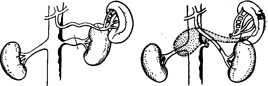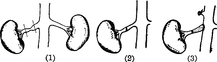 (3) 肾血管重建手术(肾血管成形术或修复术)。肾血管重建术的方法主要有下列几种: ❶动脉血栓内膜剥除术,适用于肾动脉开口或其近端1/3的动脉粥样硬化斑块或内膜增生病变。纵形切开肾动脉,分离和剥除腔内所有动脉粥样硬化斑块或增生内膜。必要时,加用一片状移植物将其边缘与动脉的切口对准缝合。 ❷旁路移植术,亦称“搭桥”手术,适用于肾动脉狭窄伴有狭窄后扩张的病例。手术方法是借用一段大隐静脉或相等直径的人工血管,将其两端分别与腹主动脉和扩张部分肾动脉相吻合,使腹主动脉血液通过移植管道流入肾动脉,增加患肾血供,纠正肾缺血,改进肾功能和降低高血压。对双侧病变亦可利用两支移植血管分别将二侧肾动脉与腹主动脉吻合。 ❸脾肾动脉吻合术,适用于左肾动脉近端狭窄性纤维肌肉增生病变或腹主-左肾动脉交界处有广泛性硬化阻塞病变而不宜施行动脉内膜剥除术者。 ❹肾动脉狭窄切除和血管移植术,适用于肾动脉局限的纤维增生狭窄,狭窄的长度在1~2cm之内。切除病变的血管,将断端作对端吻合。如病变部位近肾动脉开口处,则将切断的肾动脉远端直接与腹主动脉相吻合。若肾动脉缺损过长,则可用适当长度的自体血管或人工血管代替。 血管旁路术的图解