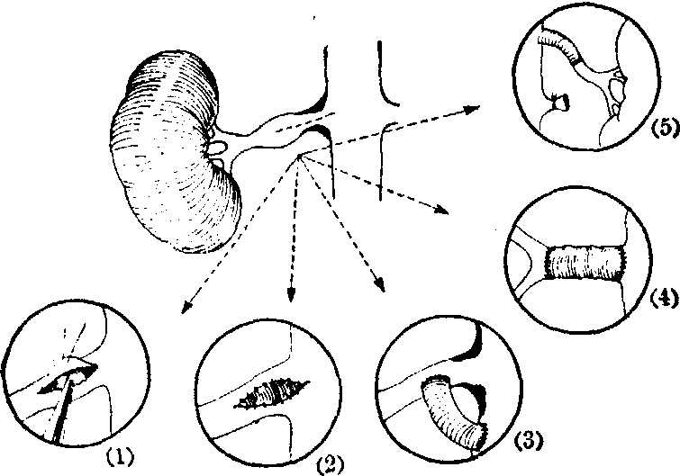 (1) 肾血管重建术 (图):适用于局限的狭窄,包括: ❶肾动脉狭窄段切除术。 ❷肾动脉再植术。 ❸动脉内膜栓塞切除术。 ❹血管壁成形术、切开狭窄处,缝补一小块人造血管片以扩大管腔。 ❺用移植物(大隐静脉、人造血管)于肾动脉和主动脉间搭桥。 ❻移植物替换术,切除长段狭窄血管后,用适宜长度的移植物代替。 ❼脾肾动脉吻合术。 (2) 自体肾移植术:适用于肾动脉近端狭窄,邻近的腹主动脉有广泛病变者。 (3) 肾部分切除术:肾脏一极的血管分支狭窄或栓塞,导致局部萎缩,可将病变部分切除。 (4) 肾切除术:肾动脉狭窄广泛,病变不可逆转,病肾明显萎缩,肾功能严重损害,对侧肾功能良好,或病人一般情况差,不能耐受较大手术者,宜切除病肾。 ☚ 小儿同种肾移植 输尿管畸形 ☛ |