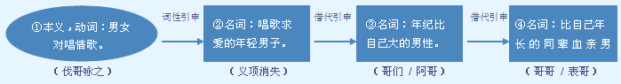 字源解说 “可”是“哥”的本字。 ,本义为古代男女以吹笙唱歌方式求偶。当“可”的“吹笙唱歌”本义消失后,再加“可”另造“哥”代替。哥,篆文 = (唱歌求偶)+ (唱歌求偶),造字本义:男女对唱情歌。“哥”的“对唱情歌”本义消失后,篆文又加“欠”(吹)另造“歌”代替。 附 文言版《説文解字》:哥,聲也。从二可。古文以爲謌字。 附 白话版《说文解字》:哥,声音。字形采用两个“可”会义。古文中把“哥”当作“謌”字。 引申线索