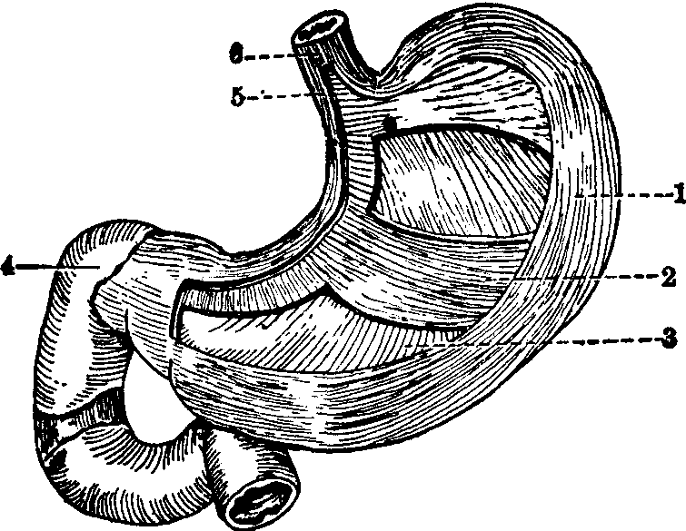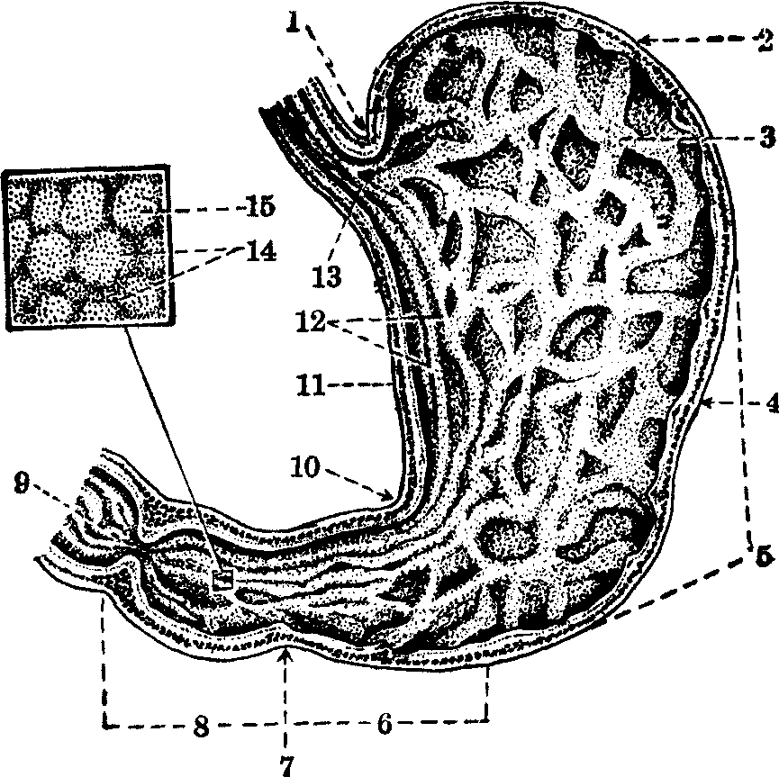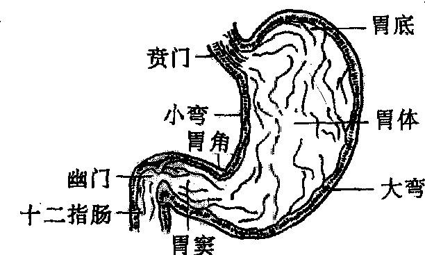 (5) 幽门腺: 分布于幽门部。此部的胃小凹较深。此腺为单或分支管状腺,较弯曲,主要由粘液性细胞组成,可有壁细胞和内分泌细胞。它分泌粘液和一些无机盐。 (6)粘膜肌层:由内环和外纵两薄层平滑肌组成,有的部位在外纵层外侧还有一层环行平滑肌。内环层伸出平滑肌束到胃腺的周围,平滑肌束收缩可能帮助腺排出分泌物。 粘膜下层 由较致密的结缔组织组成,含较大的血管和淋巴管,并有较多的肥大细胞、淋巴细胞和嗜酸性粒细胞;有时有成群的脂肪细胞。 肌层 较厚,由三层平滑肌组成。最内层为斜行,不发达,与食管环行肌层相连,由贲门向胃底、胃体方向走行,分布于胃的前后壁;在胃小弯和幽门管,纤维走向与胃小弯平行;在胃大弯渐分散与环行肌相混杂。中层为环行,较发达,与食管的环行肌相连,肌纤维的走向和胃的长轴垂直。幽门部环行肌增厚,形成幽门括约肌,收缩时封闭幽门。纵行肌位于最外层,与食管纵行肌相连,在胃大弯与胃小弯较发达,从幽门管向下与十二指肠的纵行肌相连。在环行肌与纵行肌之间的结缔组织内有肌间神经丛。 浆膜 位于肌层外面,由薄层疏松结缔组织和覆盖于表面的间皮组成。在胃大弯和小弯,浆膜与大网膜和小网膜相连。 ☚ 食管 小肠 ☛ 胃 胃胃在膈下,其上端接食道,下端接小肠。胃与食道相接处名贲门,与小肠相接处为幽门。胃的上部名上脘,下部名下脘,上下脘之间名中脘。三部统称胃脘。我国古代医学家对胃的大小,形态,位置和重量等,已有了较详尽的记述。《灵枢·肠胃》说“胃纡曲屈,伸之长二尺六寸,大一尺五寸,径五寸”。现知胃大弯的长度约为四十公分,周代的二尺六寸,约合五十二公分,虽稍偏大,但亦证明前人是经过实际观察的。明·李梴的《医学入门·胃腑赋》说:“胃号太仓,俗名曰肚。……上透咽门,而受其所吞,曲接小肠,而传其所腐”。这就明确指出了胃上接食管,下通小肠的正确位置及其受纳传化的生理功能 。 ☚ 六腑 小肠 ☛ 胃wèi ❶ (消化器官的一部分) stomach: 洗 ~ wash out the stomach; ~ 痛 have a pain in the stomach; 她吃得太多, 伤了 ~。 She injured her stomach by eating too much. 胃stomach 胃stomach 胃wèistomach 胃wèi